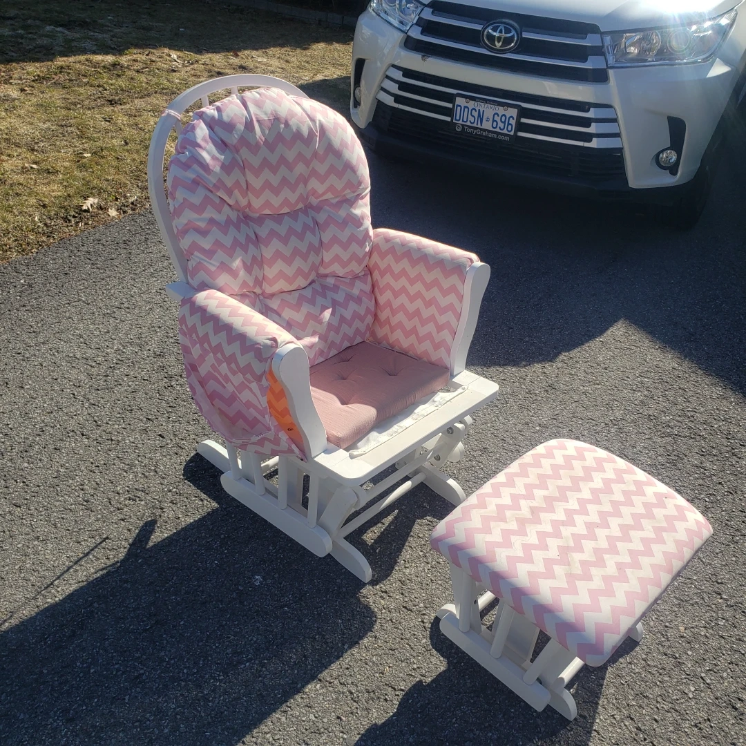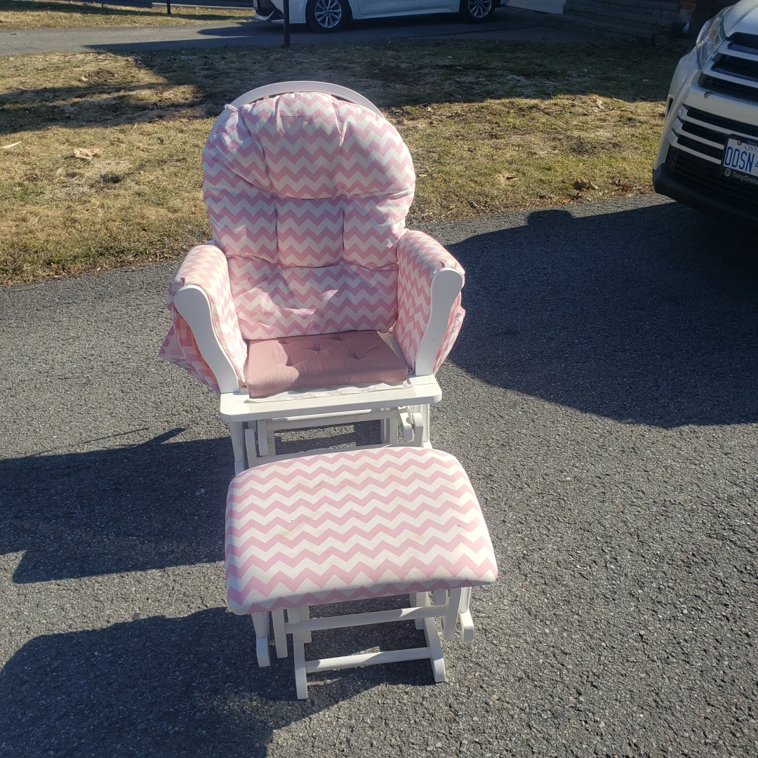 Glider rocker and ottoman set. White wooden frame. Pink and white chevron patterned cushions. Perfect for nursery or living room.