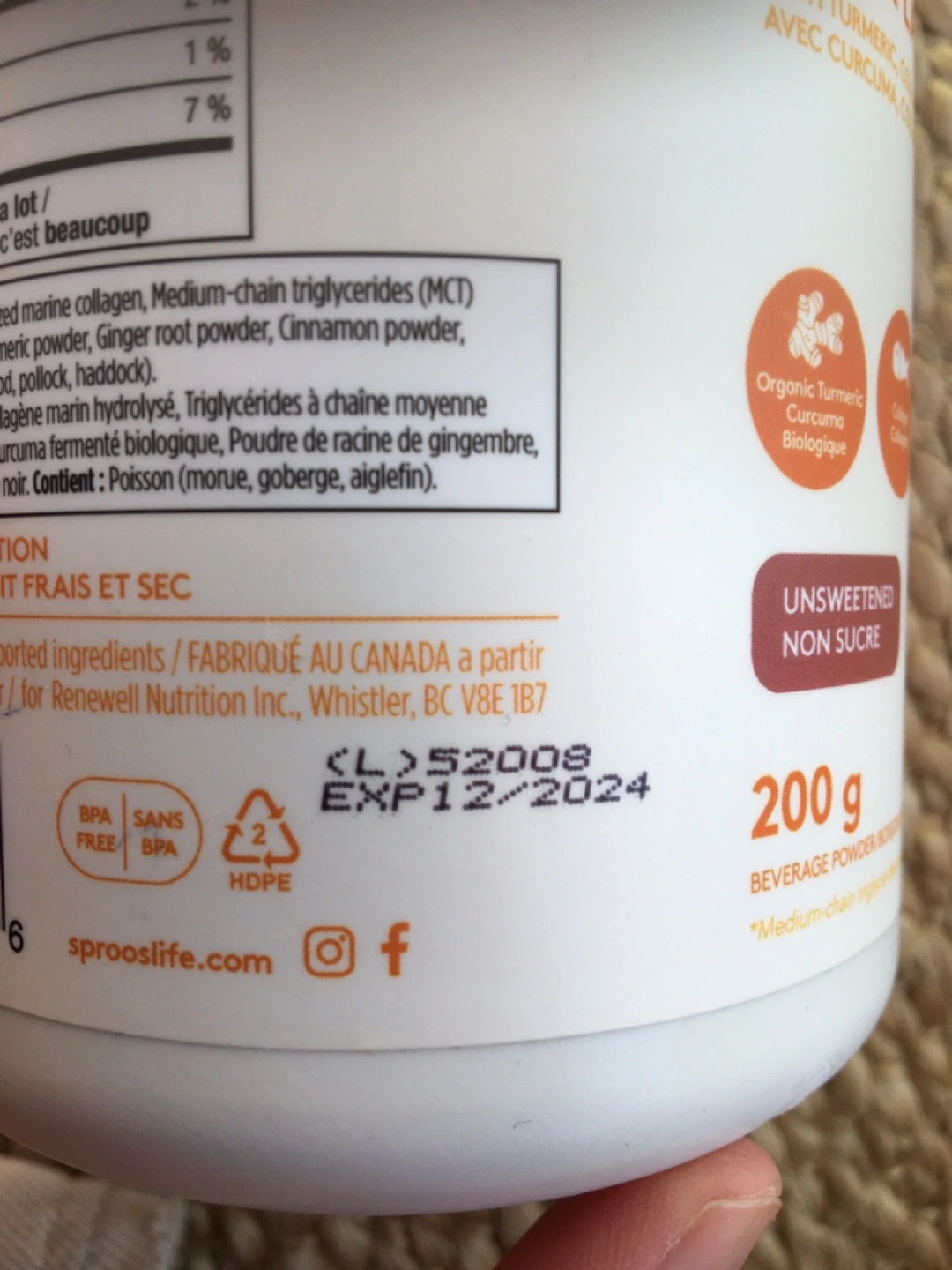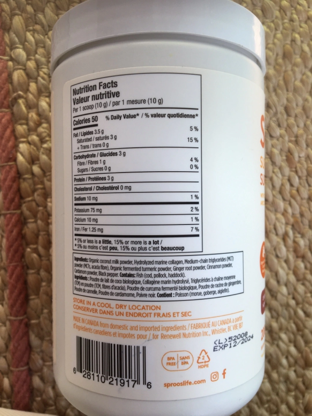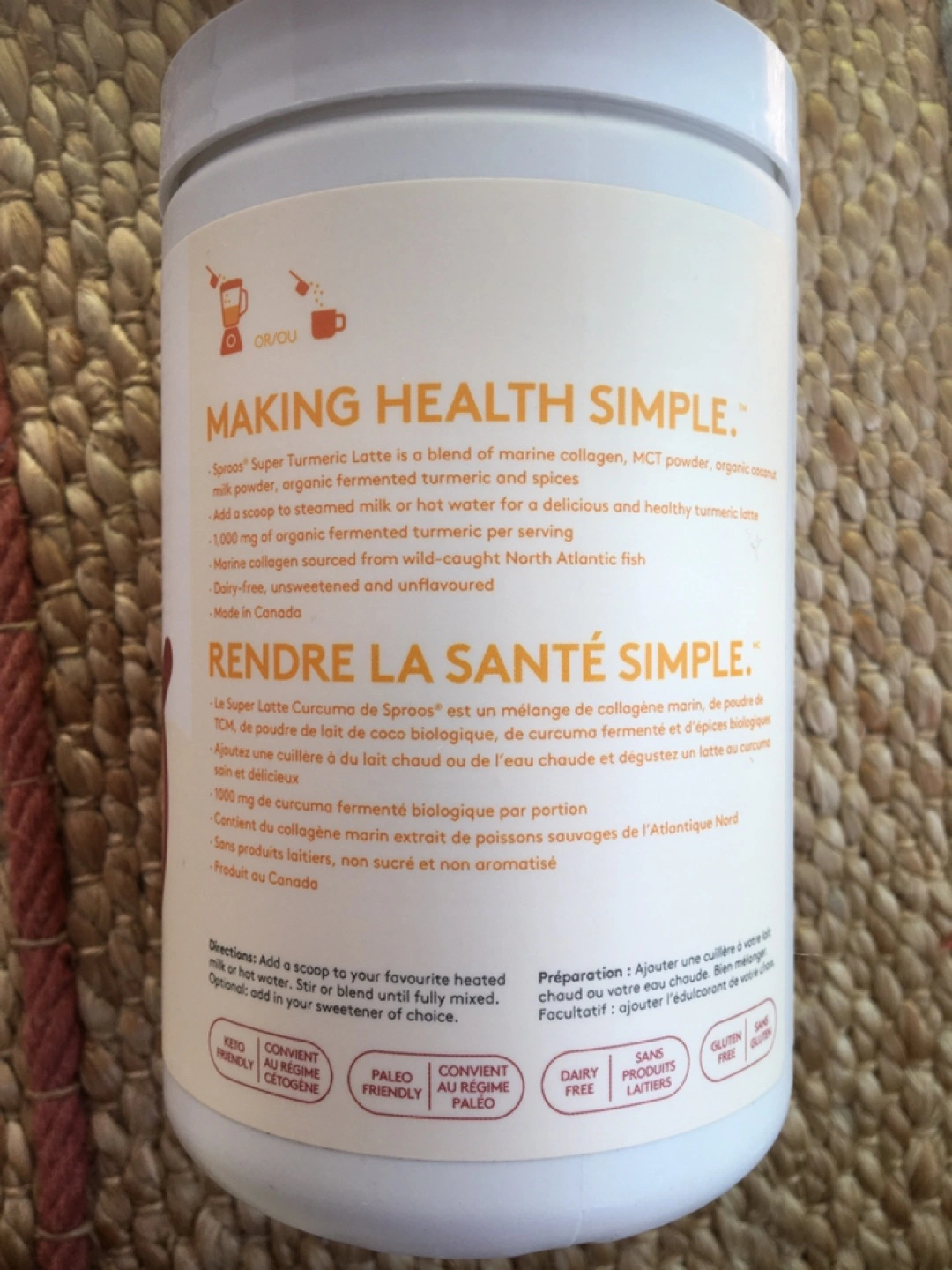 118New, unopened 200g container of SPROOS Super Turmeric Latte. Unsweetened beverage powder with turmeric, collagen, coconut milk, and MCT powder. Made in Canada. Best before 12/2024.