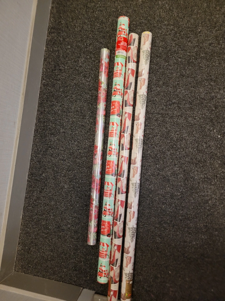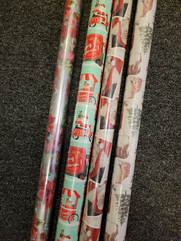 1000+Four rolls of Christmas wrapping paper. Various designs including poinsettias, Santa Claus, and woodland creatures. Perfect for holiday gift wrapping. Unused. **** Pickup Only **** **** First Come/ First Serve **** **** No Holds or Reserves unless purchasing additional item ****