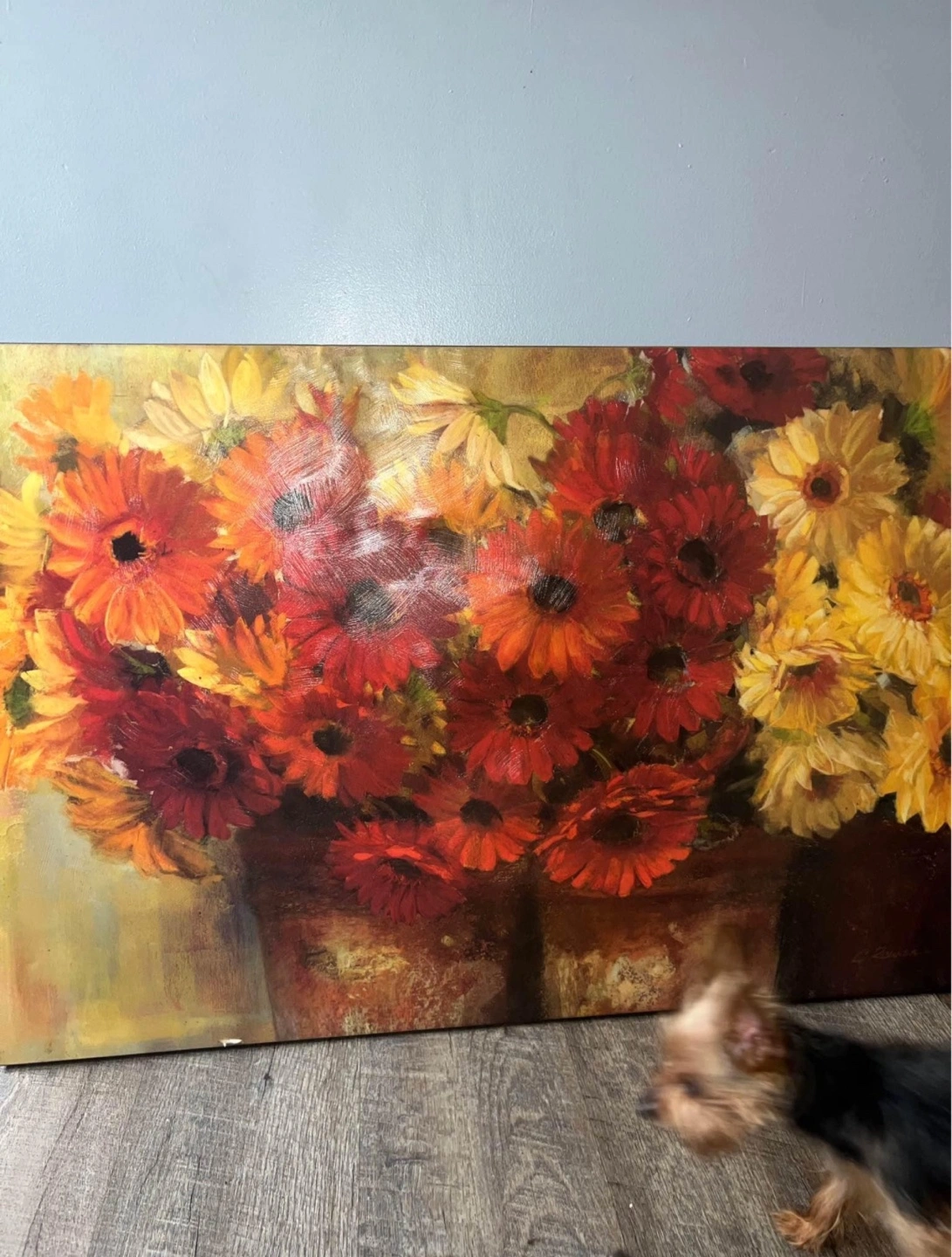 Large canvas print. Features a bouquet of red, orange, and yellow flowers. Beautiful autumnal colors. Ready to hang.