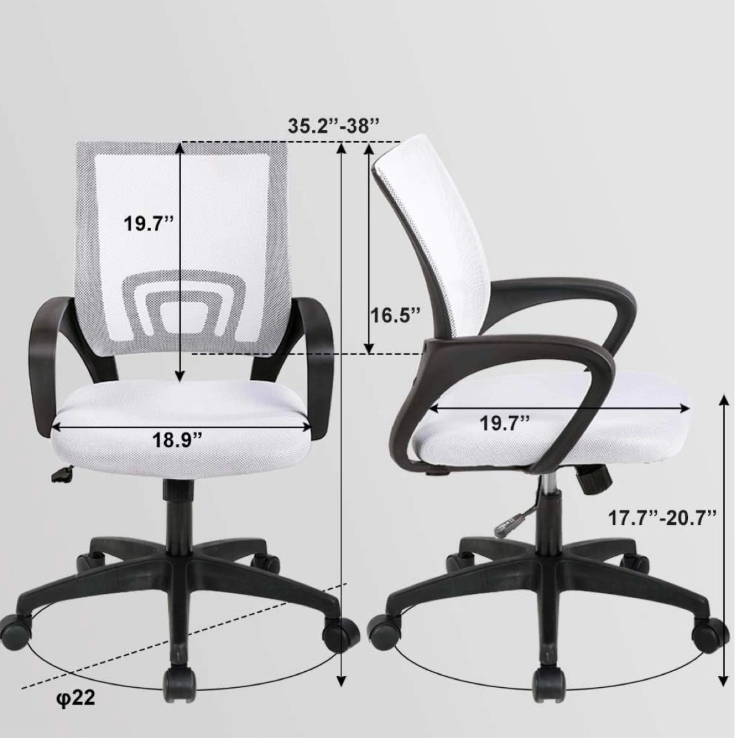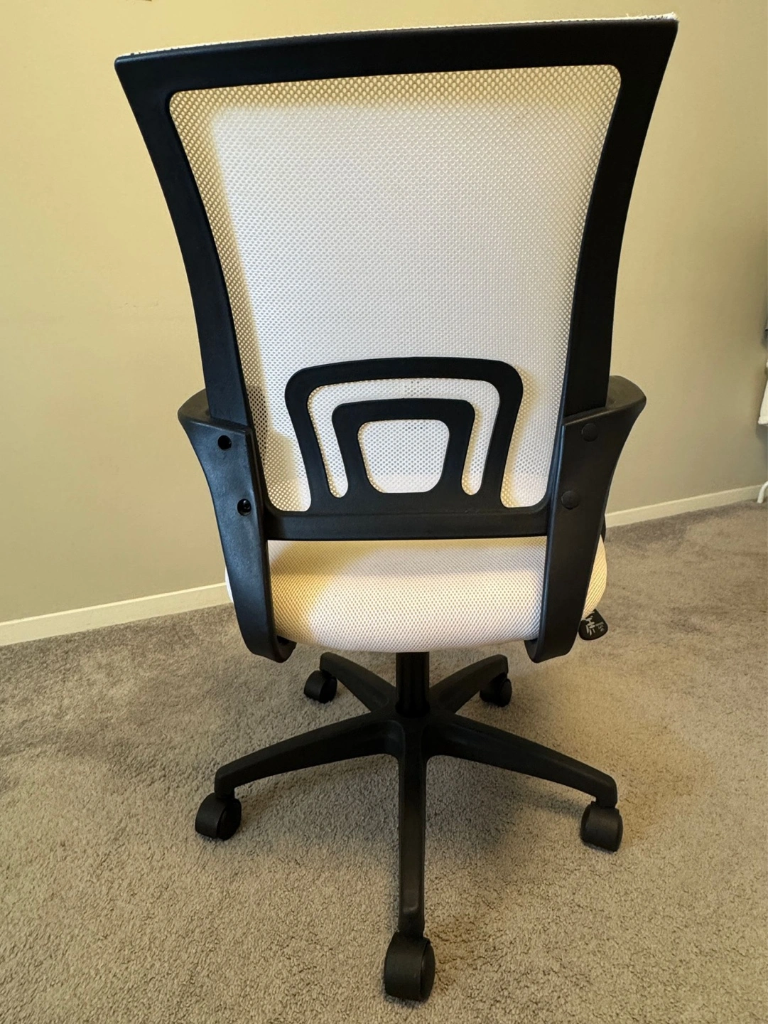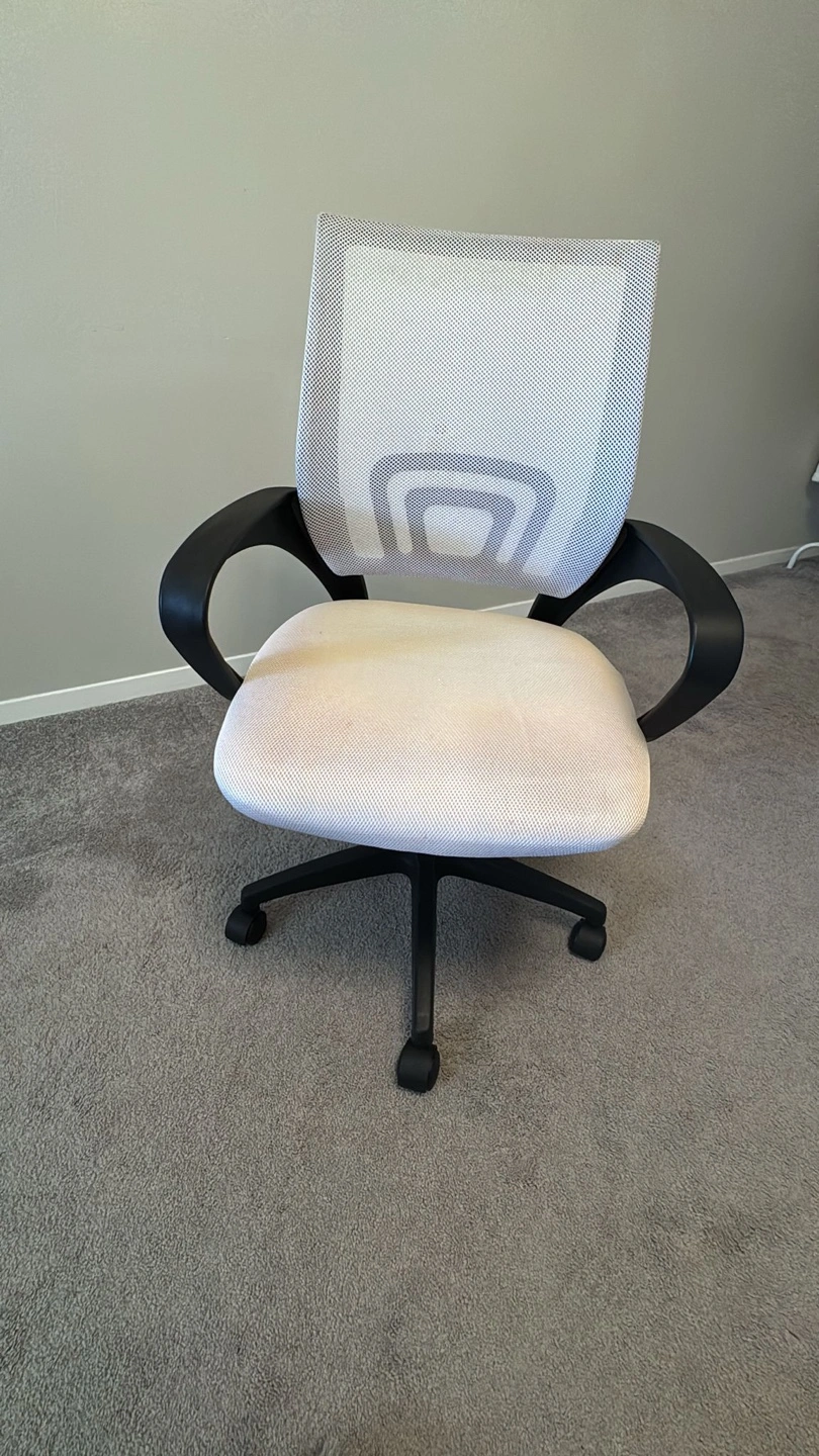 Comfortable office chair. Features mesh back and seat. Adjustable height. Five-star base with rolling casters. Some minor staining.