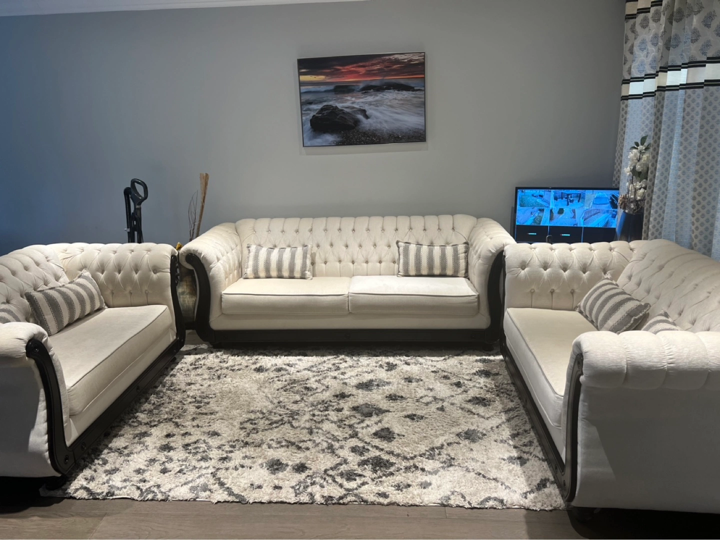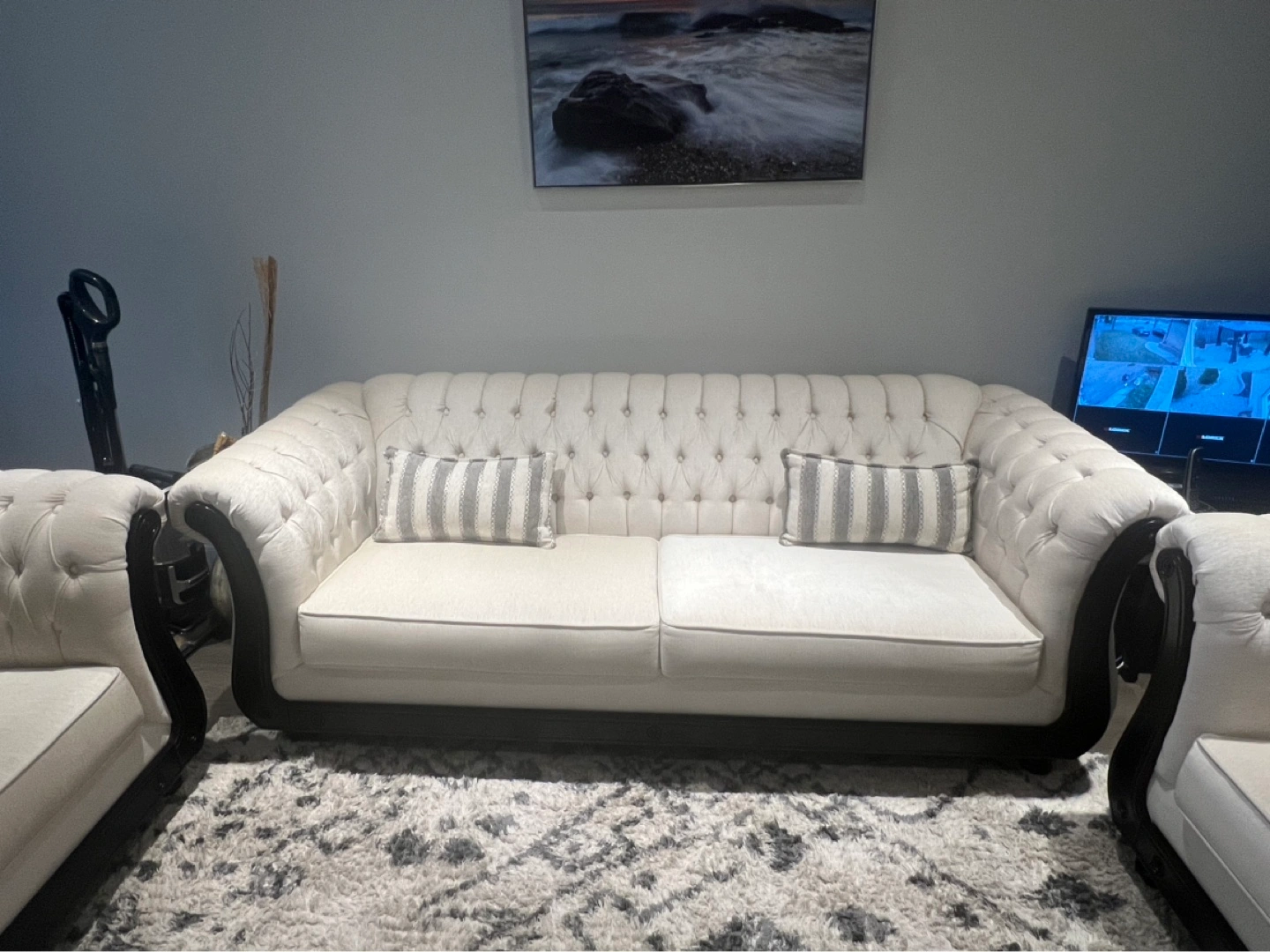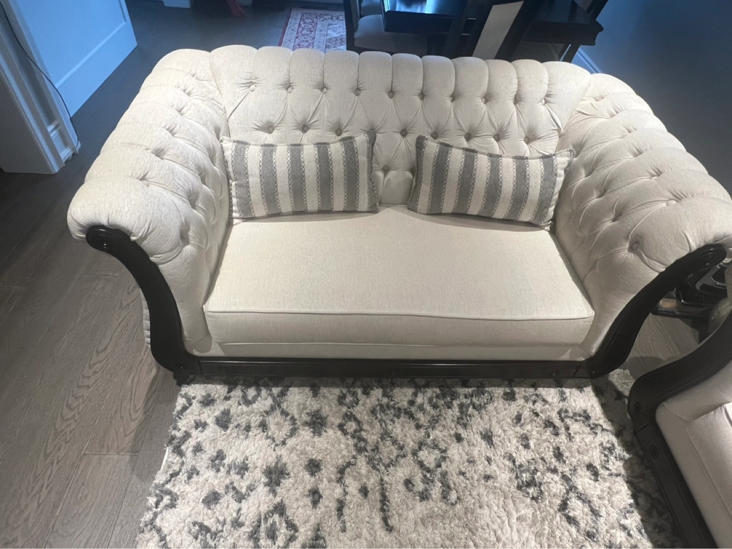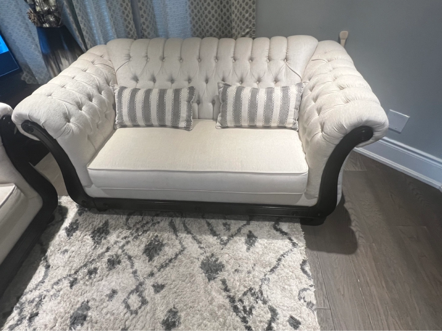 Beautiful off-white sofa set. Includes a 2 loveseat. Features button tufting and dark wood accents. Cream-coloured cushions included.
