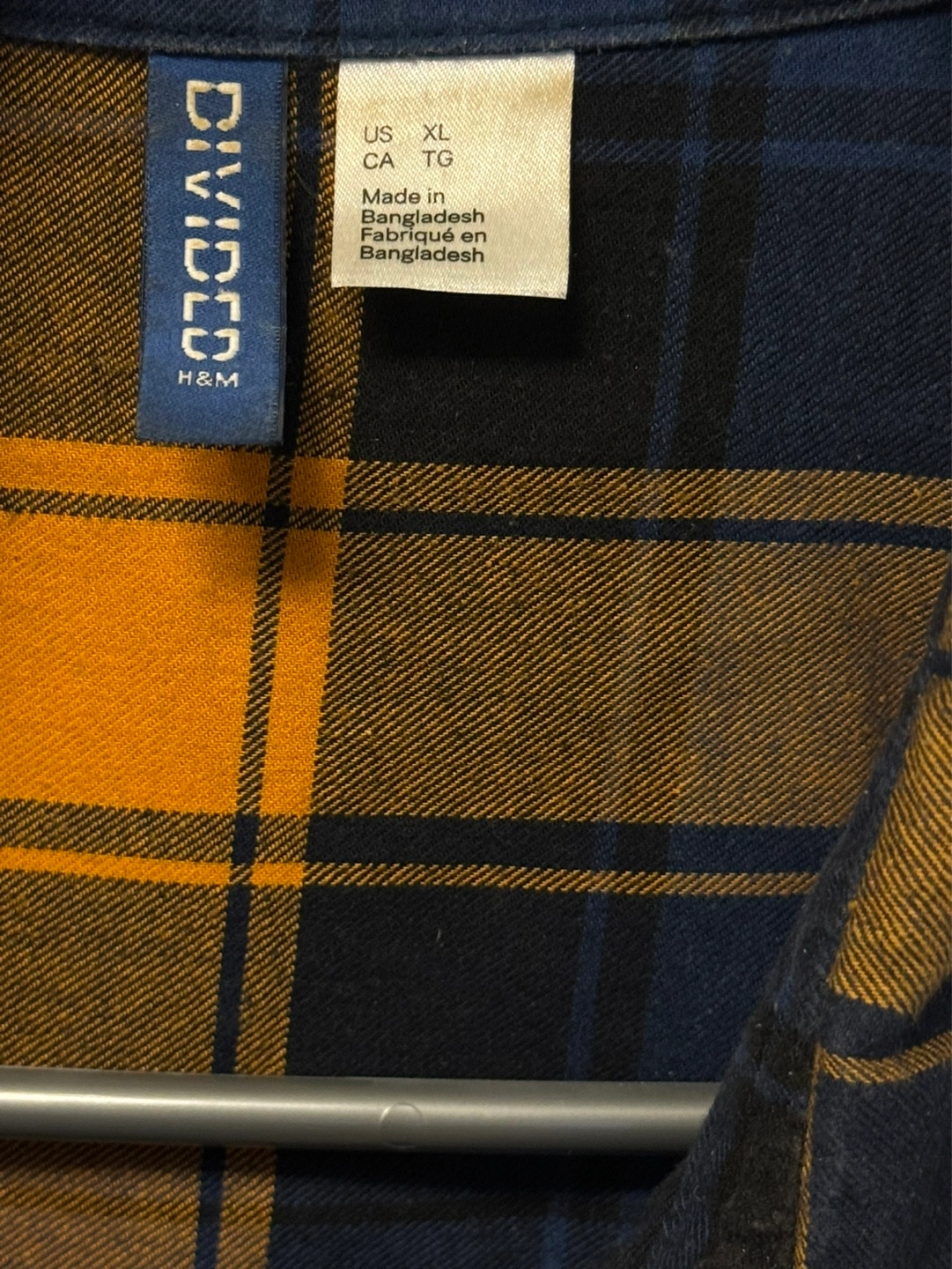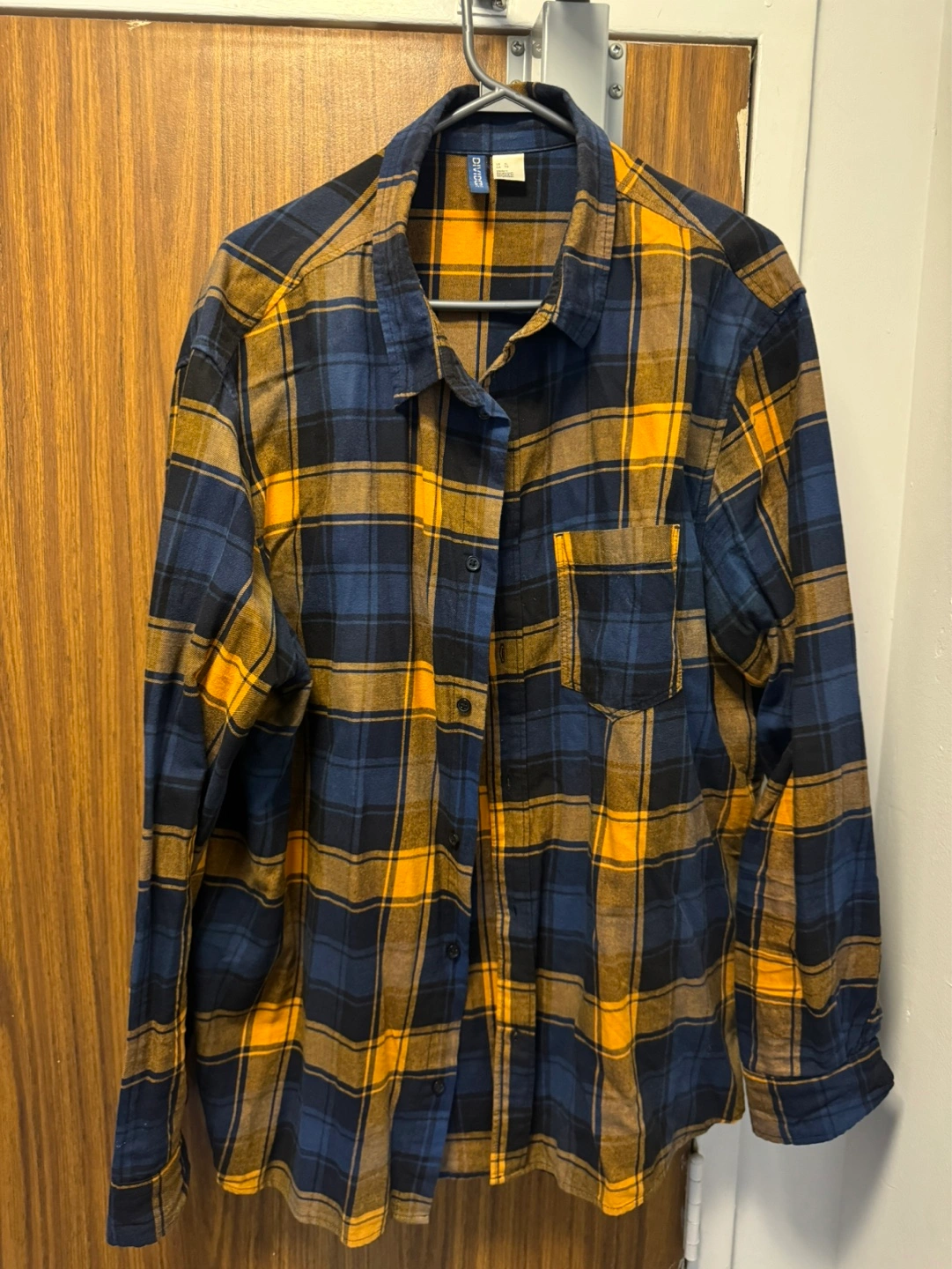 Men's long-sleeve flannel shirt. Blue and mustard yellow plaid pattern. Size XL. Button-down closure. One chest pocket.