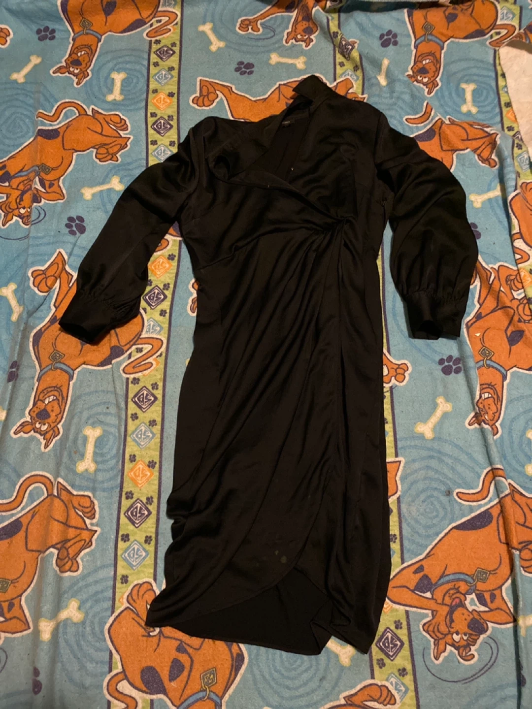 This black midi dress features a ruched detail on the side and long sleeves. The fabric appears to be a silky material. It's a versatile piece that can be dressed up or down.