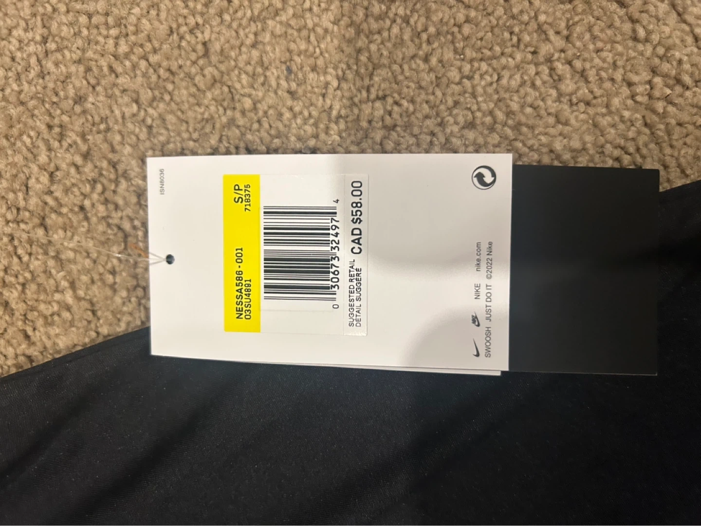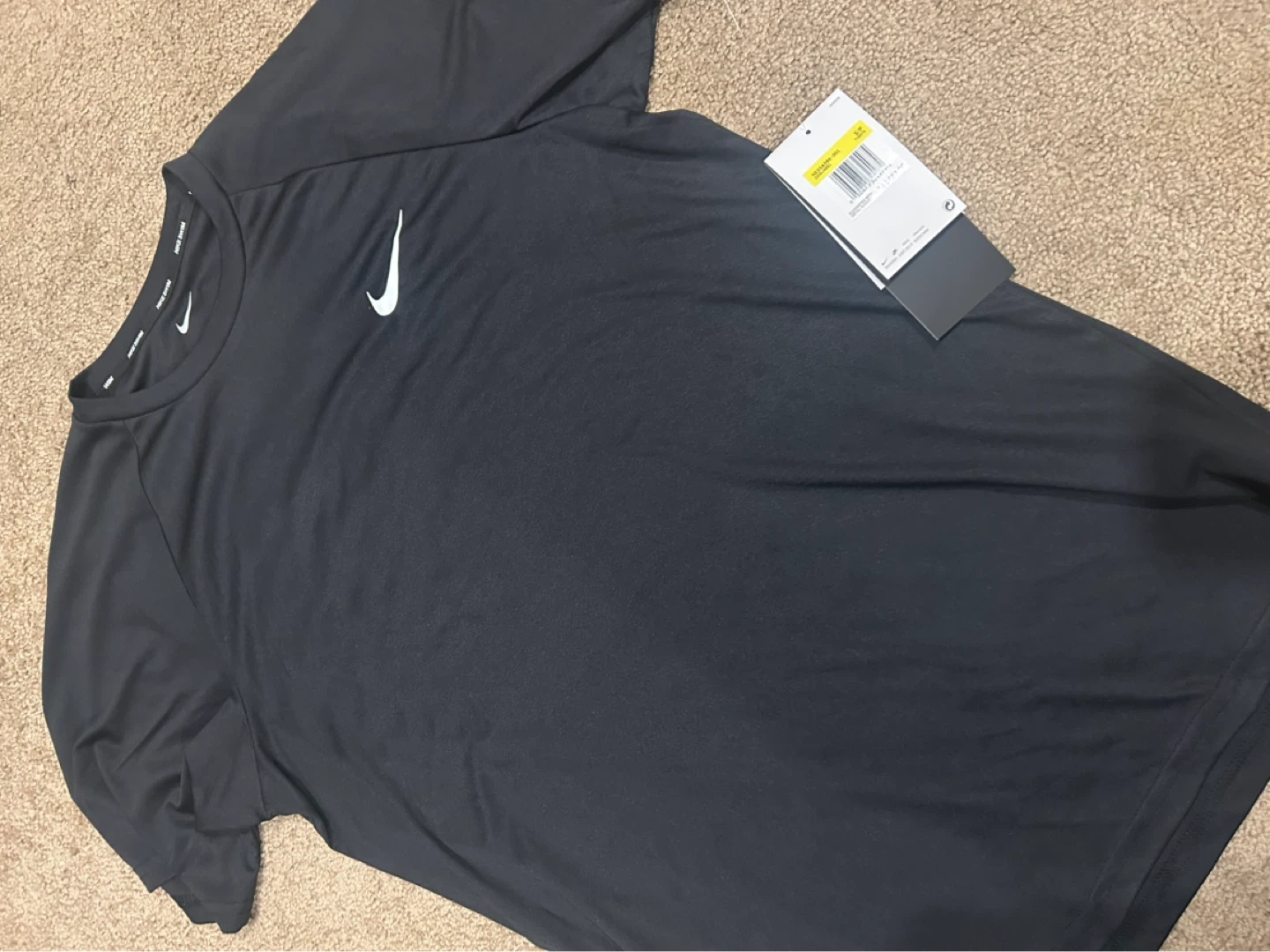 Black Nike short-sleeve t-shirt with a white Swoosh logo. Size S/P. Made with sweat-wicking fabric for comfort during workouts. Brand new with tags still attached.