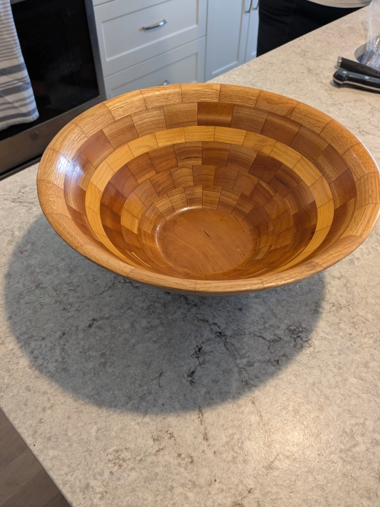 Large wooden bowl. Used less than 5 times. Beautiful craftsmanship. Unique design. Made by Dan Lancer. Northern Bay, 2011. 1cm thick lightweight