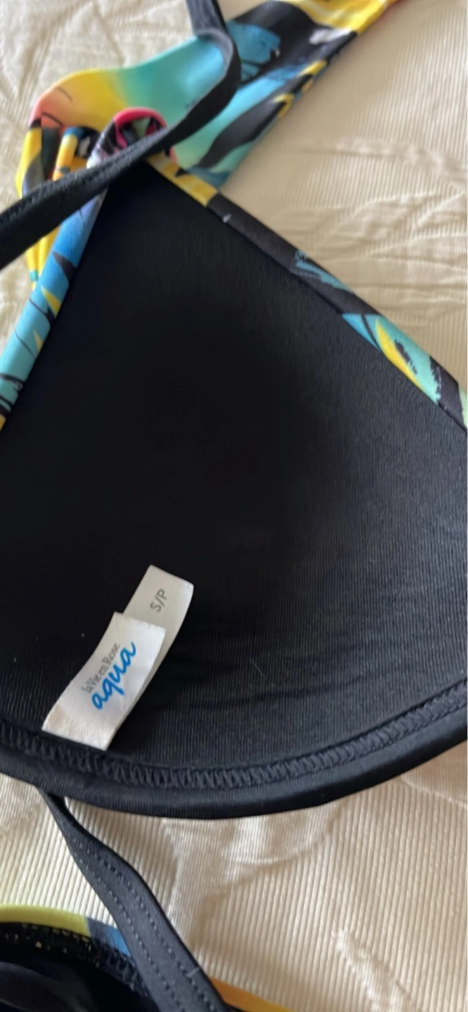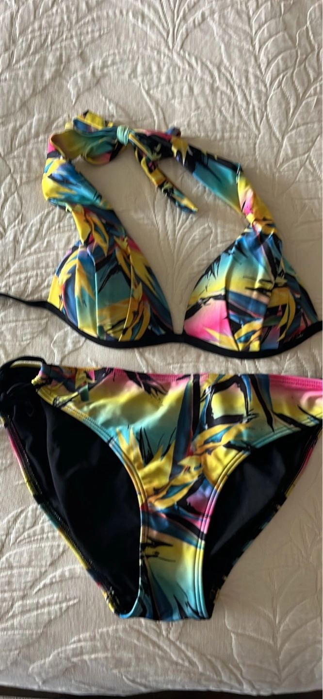 Two-piece swimsuit. Features a vibrant tropical print. Halter-style top and high-cut bottoms. Black lining. Size medium.