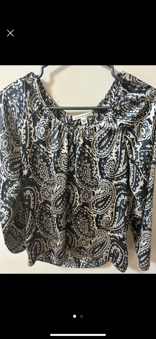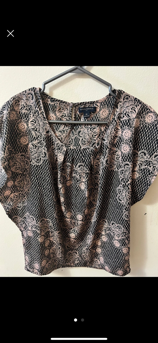 763Two beautiful Banana Republic blouses. One features a black and beige paisley print, three-quarter sleeves, and a gathered neckline. The other showcases a black and blush floral pattern on a mesh background, short sleeves, and a pleated neckline. Both are in great condition.