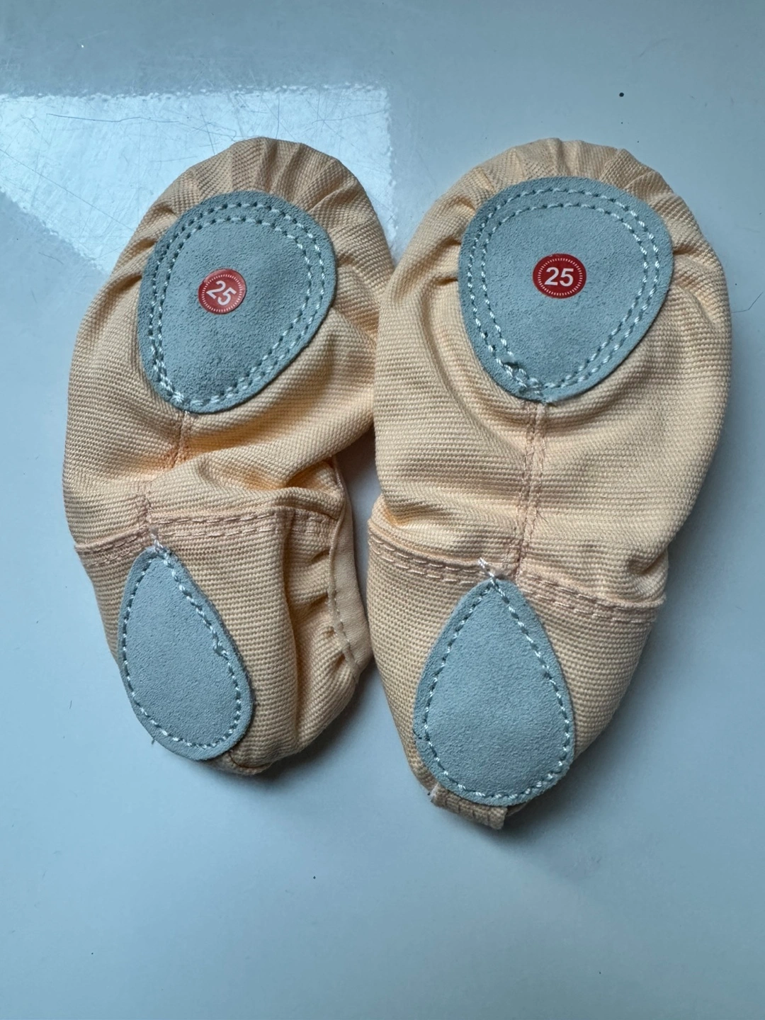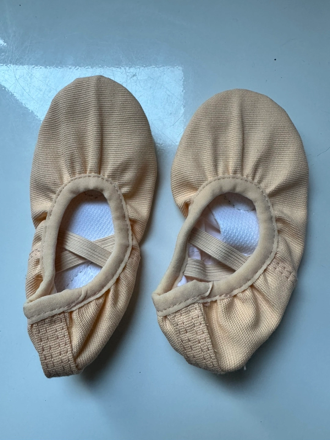 107Pair of pale beige canvas ballet slippers. Size 25. Elastic crossover strap. Good condition.