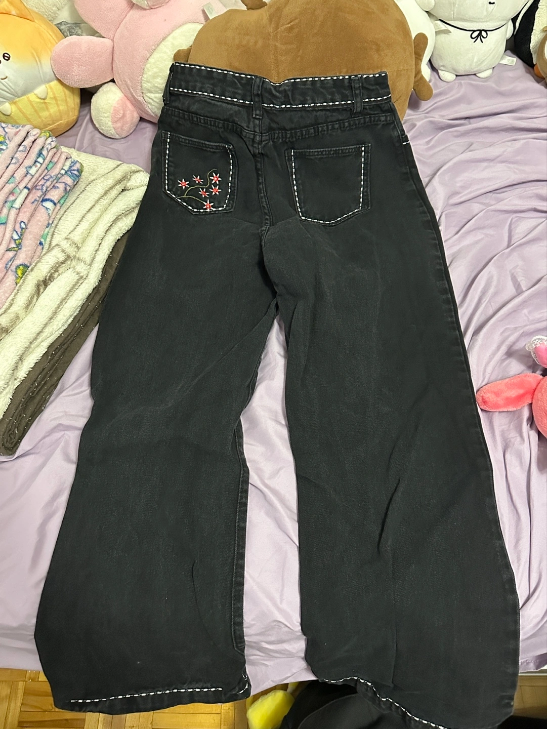 Black flare jeans with white stitching detail. Features embroidered flowers on back pocket. The zipper works fine but is a little stiff.