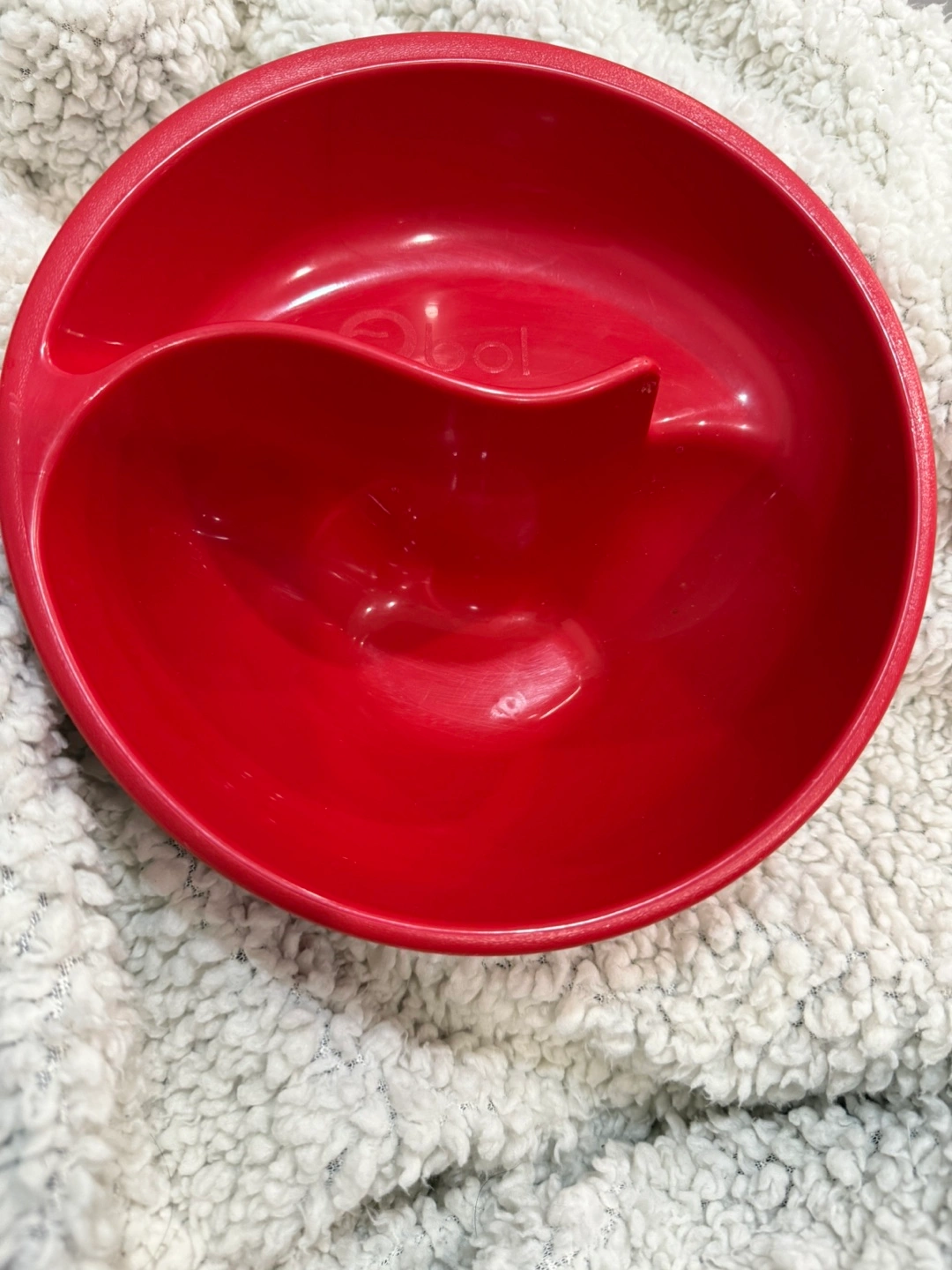 514Red plastic cereal bowl. Keeps cereal crunchy. Stackable. Divided sections. Spiral slide design. Made in the USA. Cash and pick up. C1