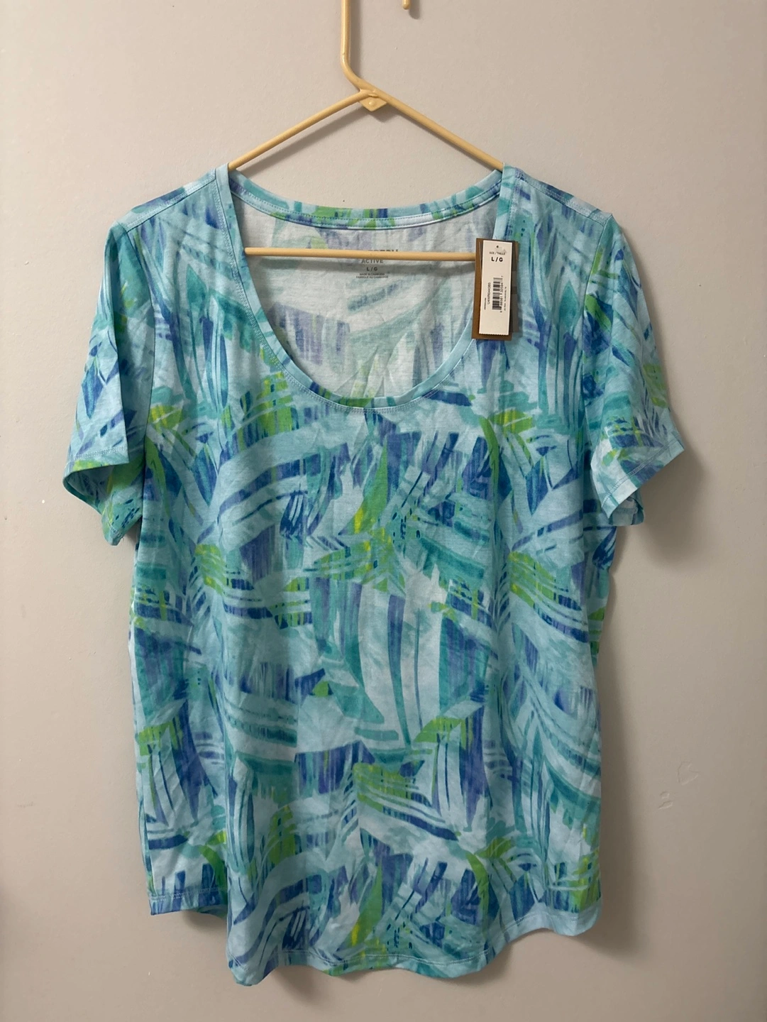 Short sleeve scoop neck top. Teal, green, and blue abstract print. Lightweight and comfortable fabric. Excellent condition.