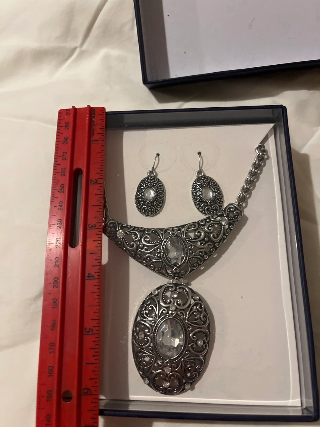 Stunning silver tone necklace and earring set. Intricate filigree design. Features clear stones. Beautiful statement jewelry. Perfect for a special occasion.