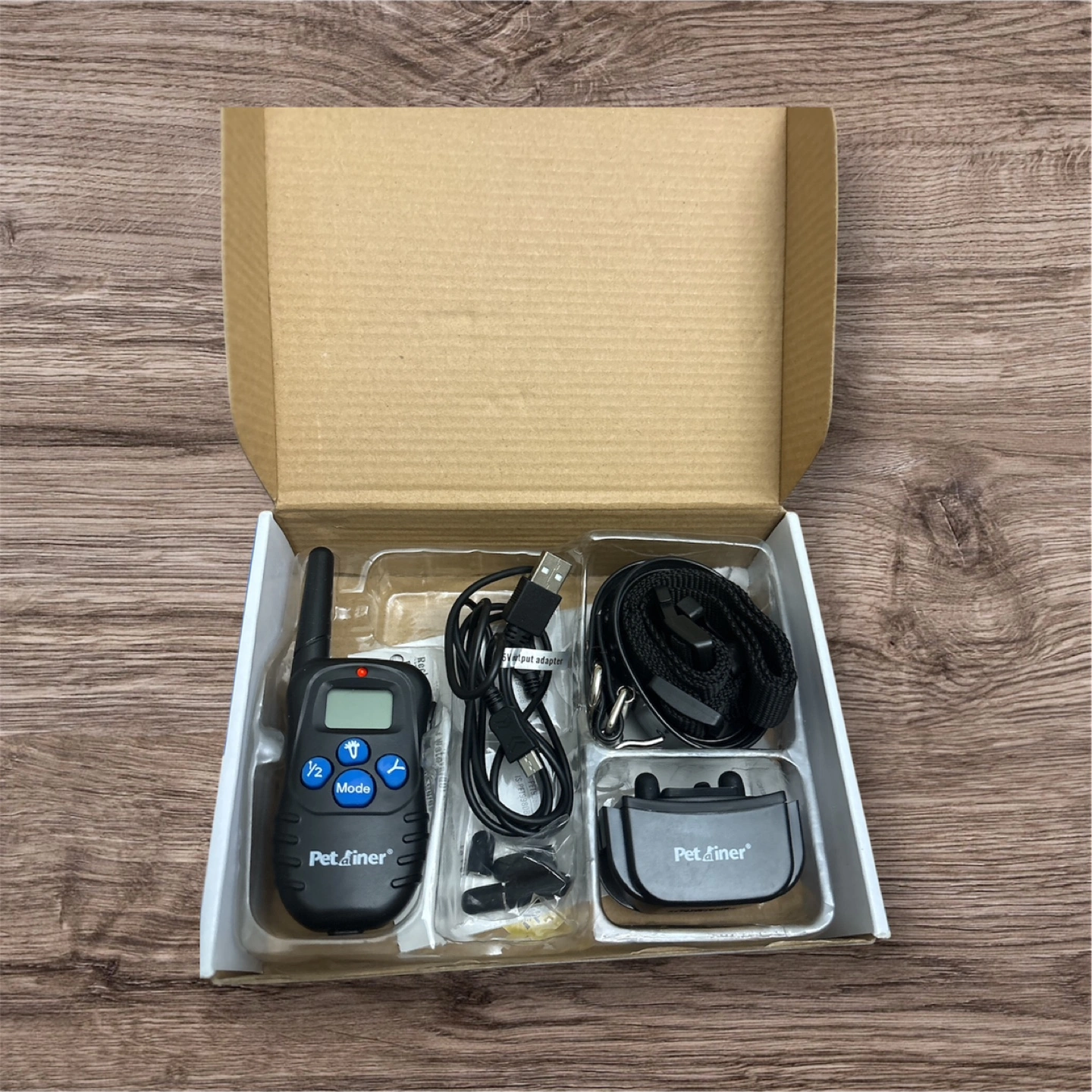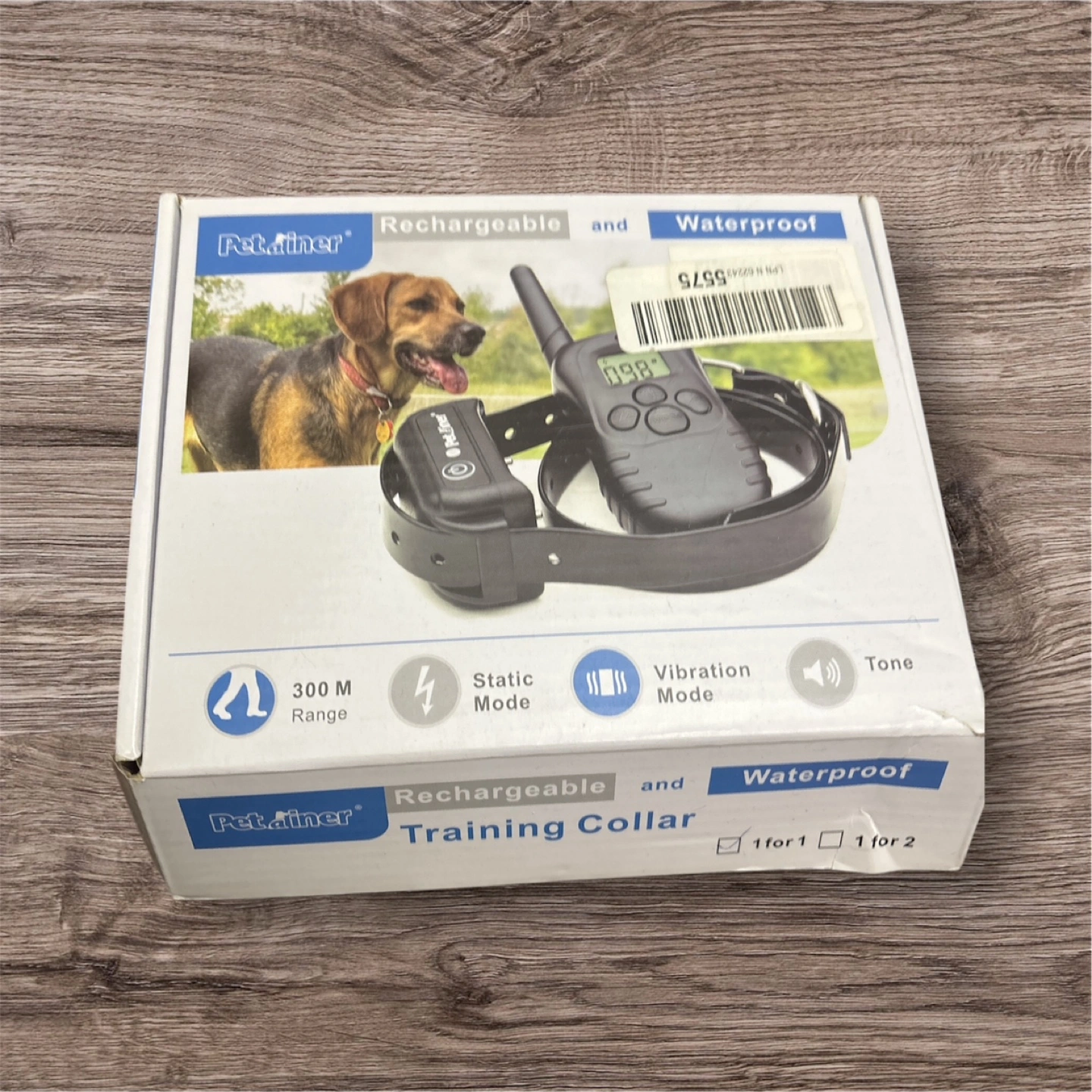 157Remote dog training collar. Includes receiver collar, remote transmitter, USB charging cable, and extra contact points. 300 metre range. Features static, vibration, and tone modes. Rechargeable and waterproof.