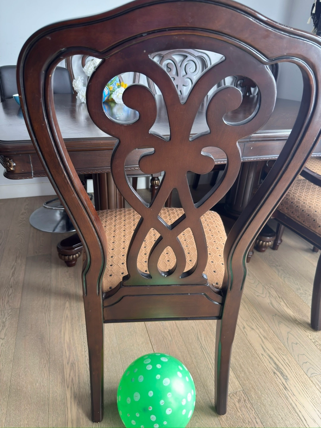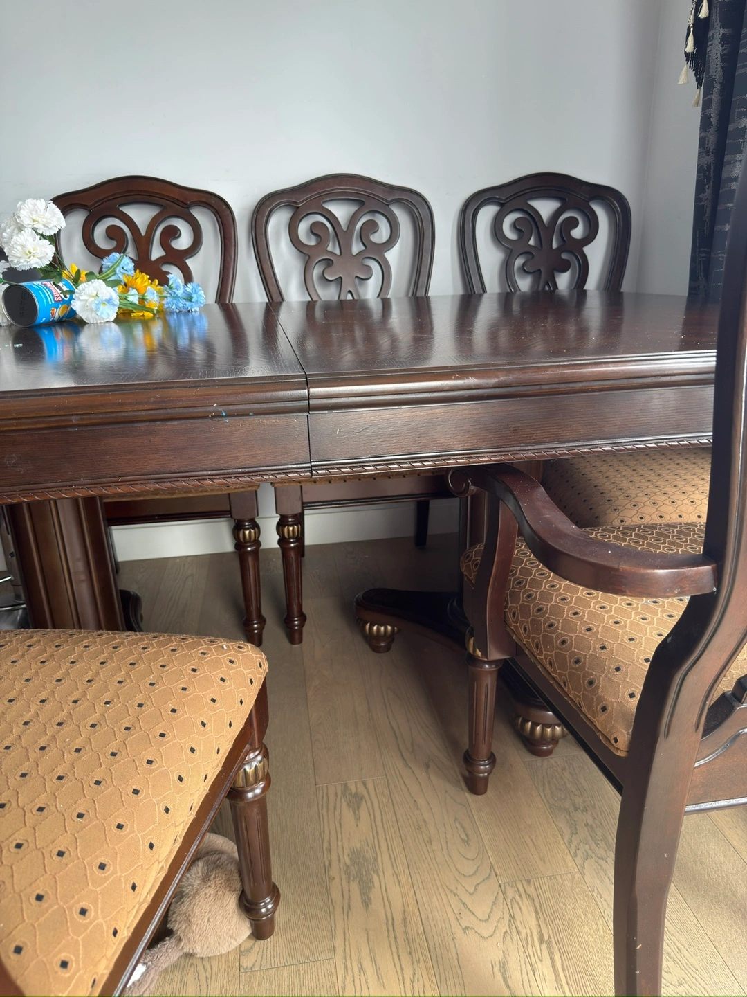 Extendable dining table and six chairs. Dark brown wood finish. Features ornate detailing on chairs and table legs. Upholstered seats in a beige and brown patterned fabric. Good condition.
