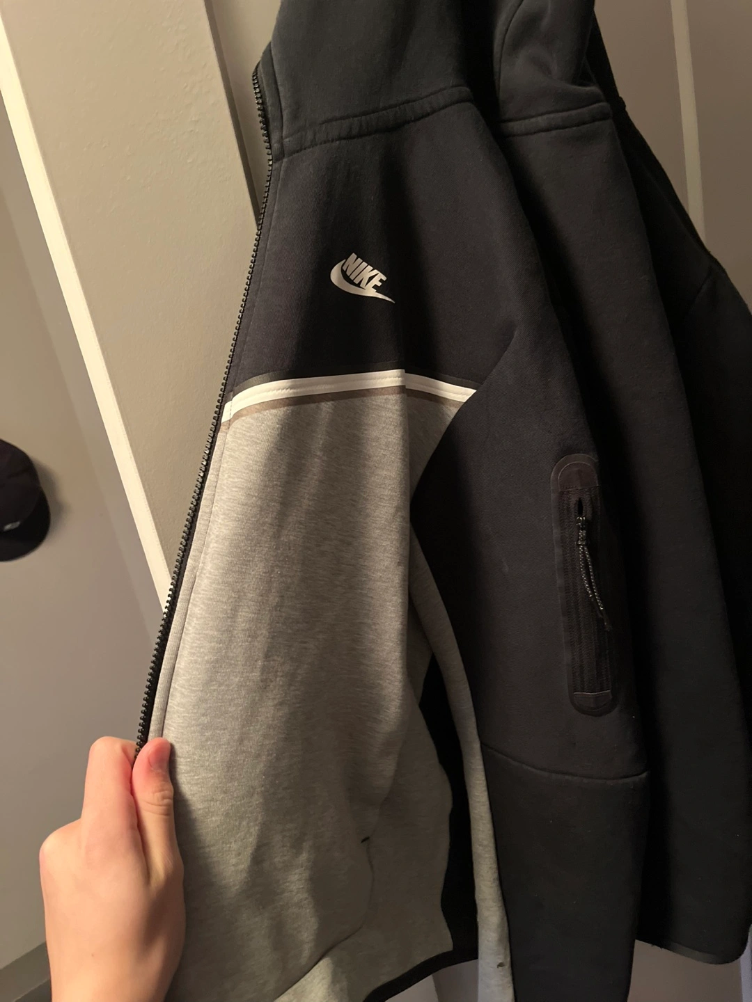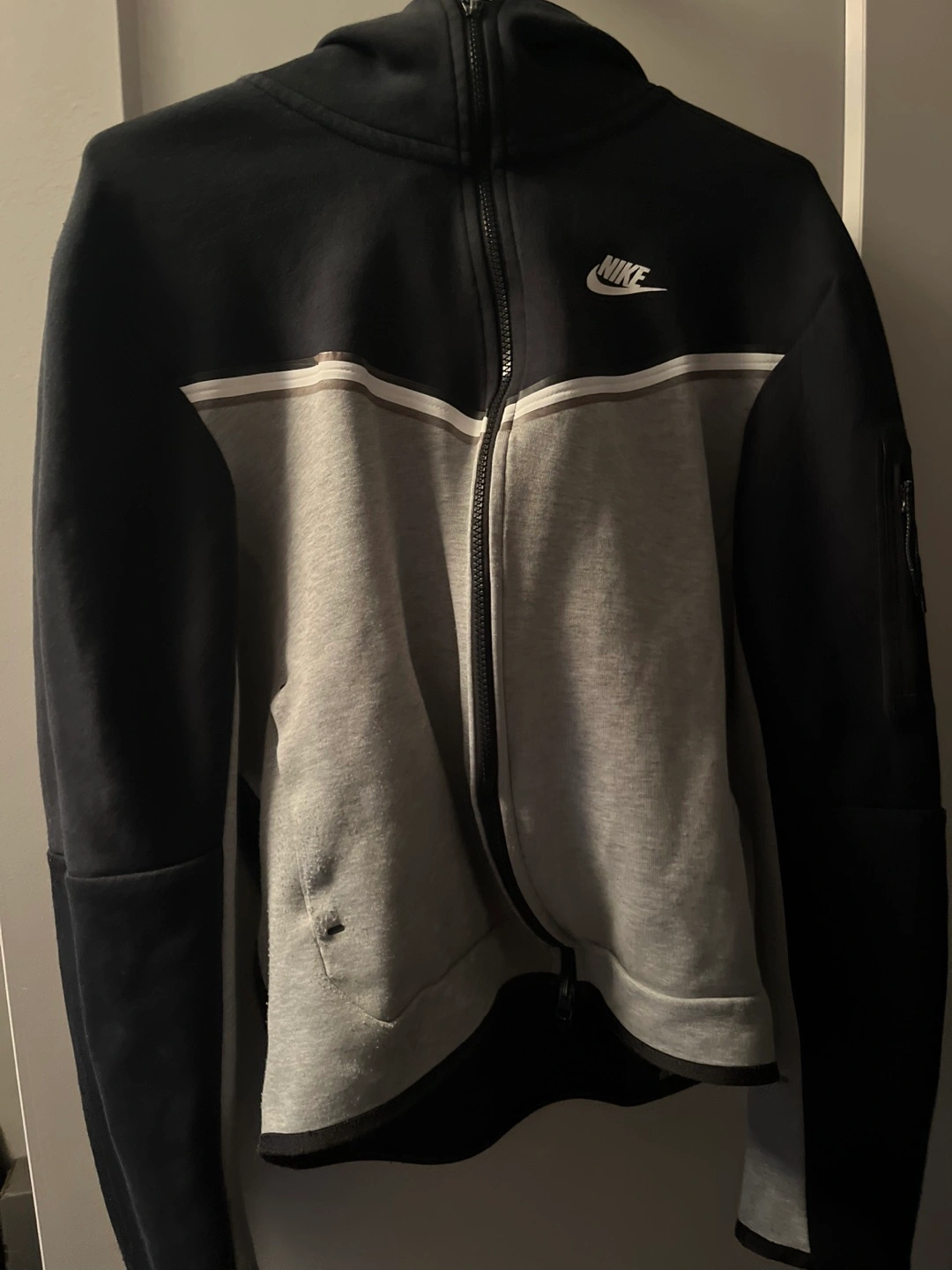 Women's Nike Tech Fleece zip-up hoodie. Grey and black colour block design. Full zip closure. Small zippered pocket on sleeve. Excellent condition.