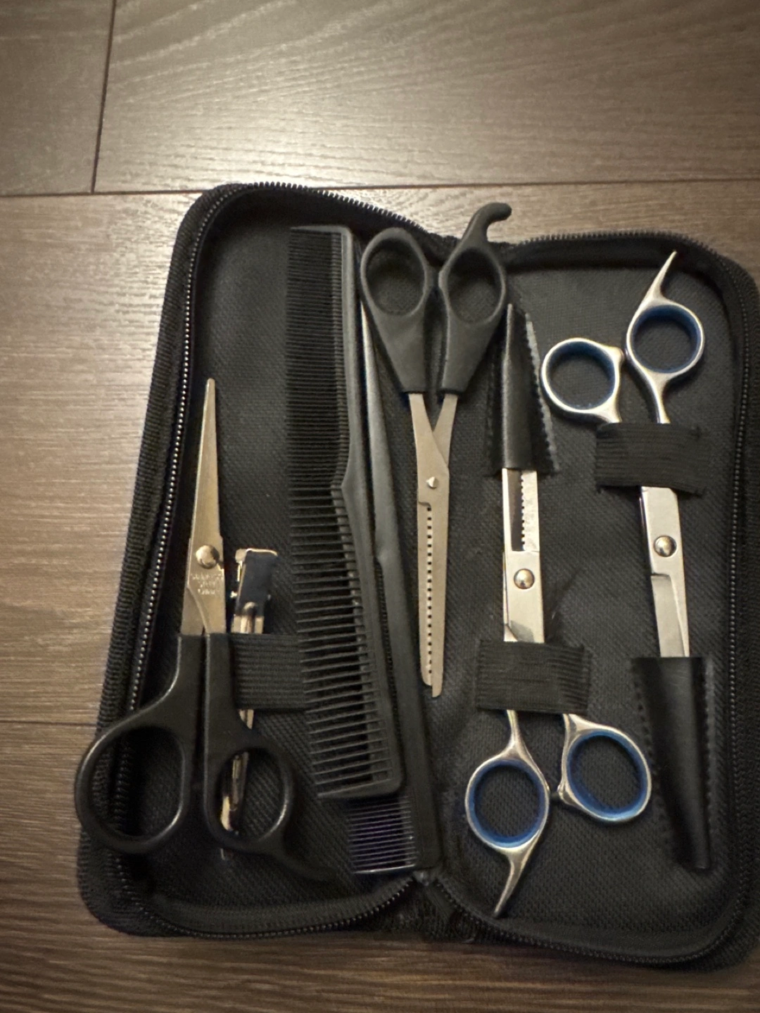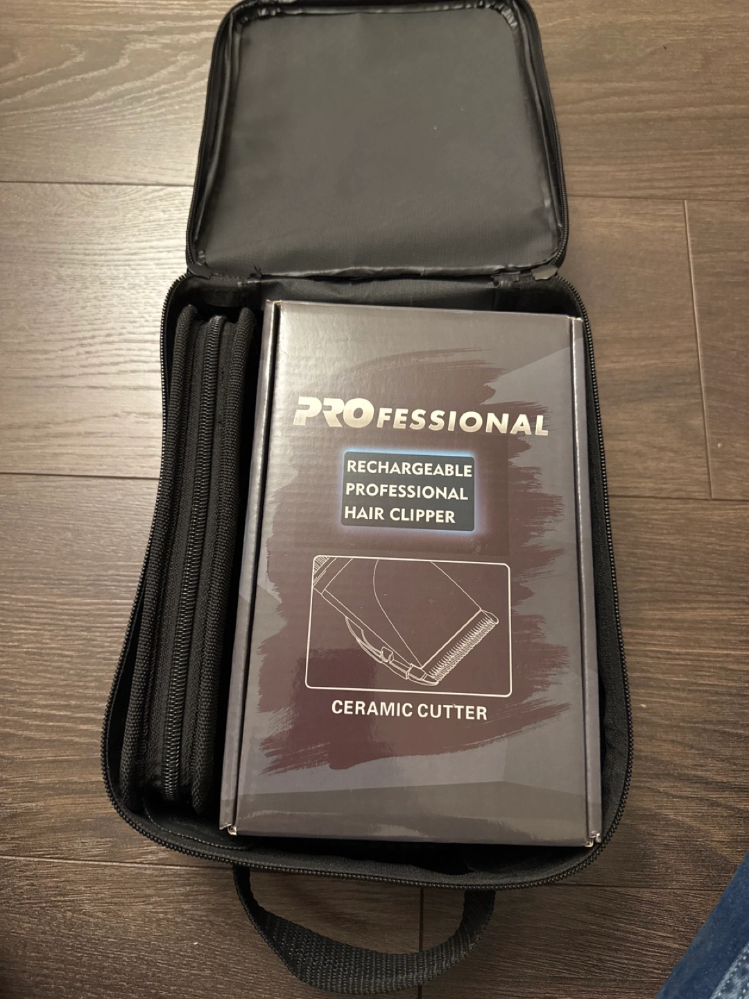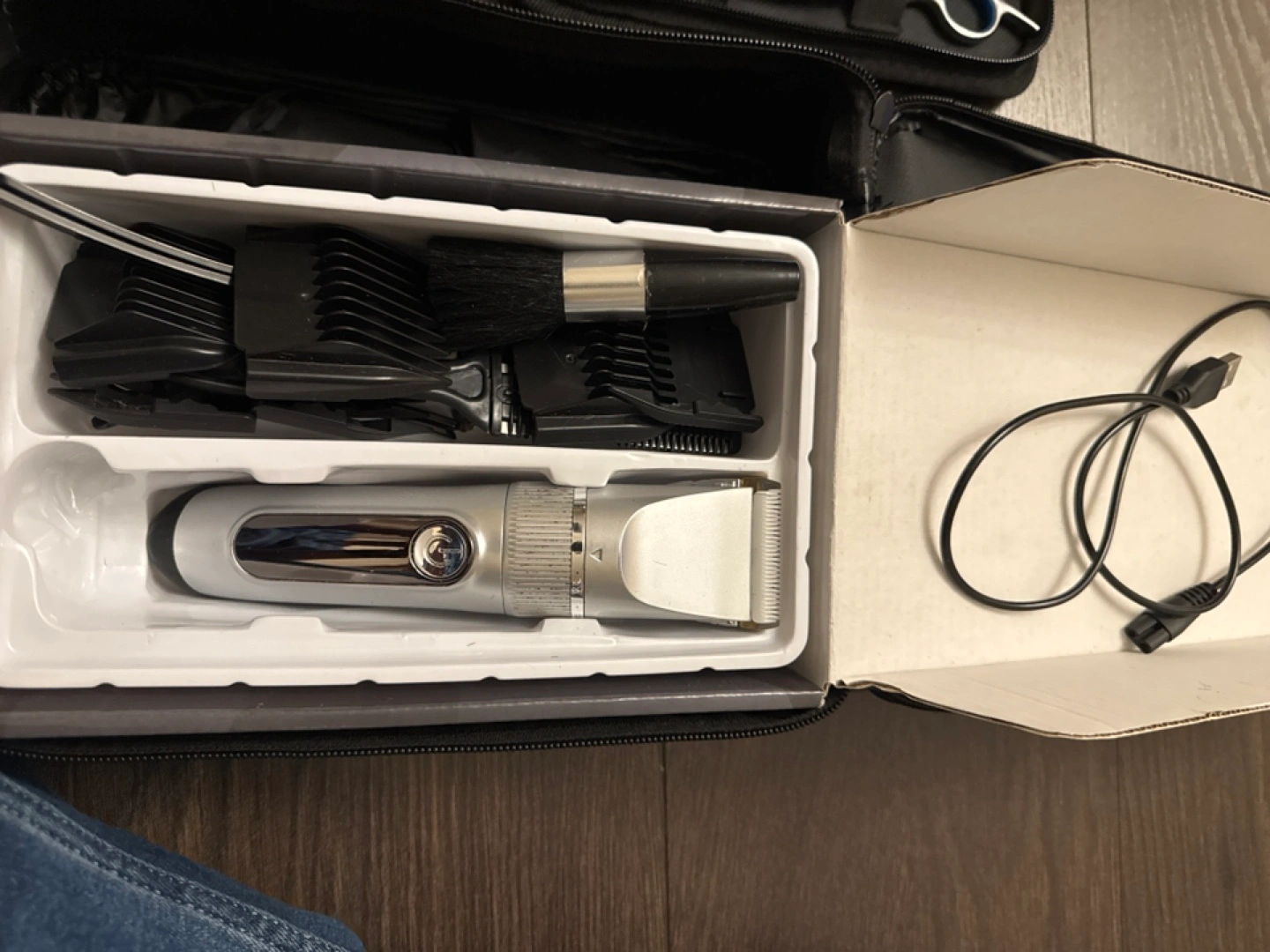 47Complete hair cutting kit. Includes rechargeable hair clipper, multiple guards, cleaning brush, USB charging cable, barber scissors, thinning shears, hair comb and a black carrying case. Ceramic cutter.