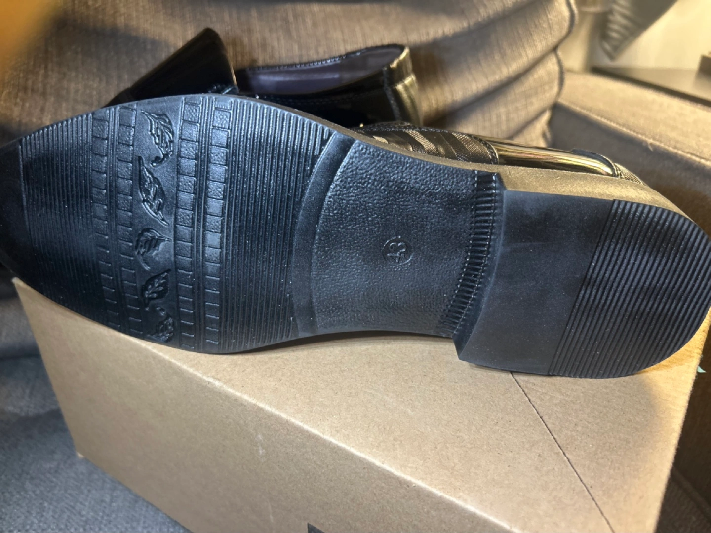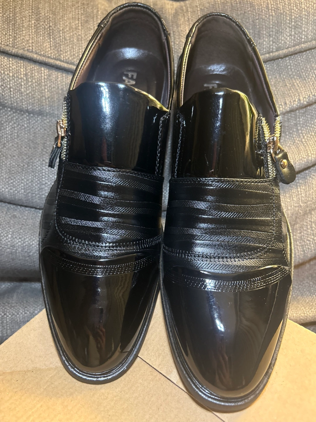 Pair of men's formal shoes. Black patent leather. Side zipper closure. Stylish and elegant. PU leather and rubber soles. Great for weddings or special occasions.