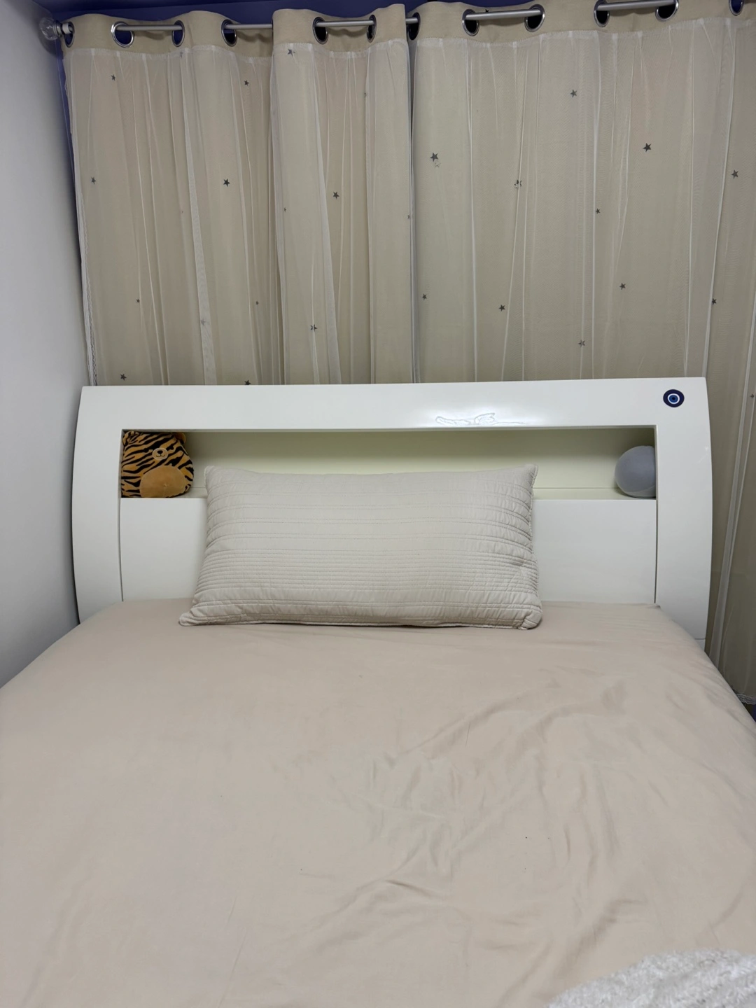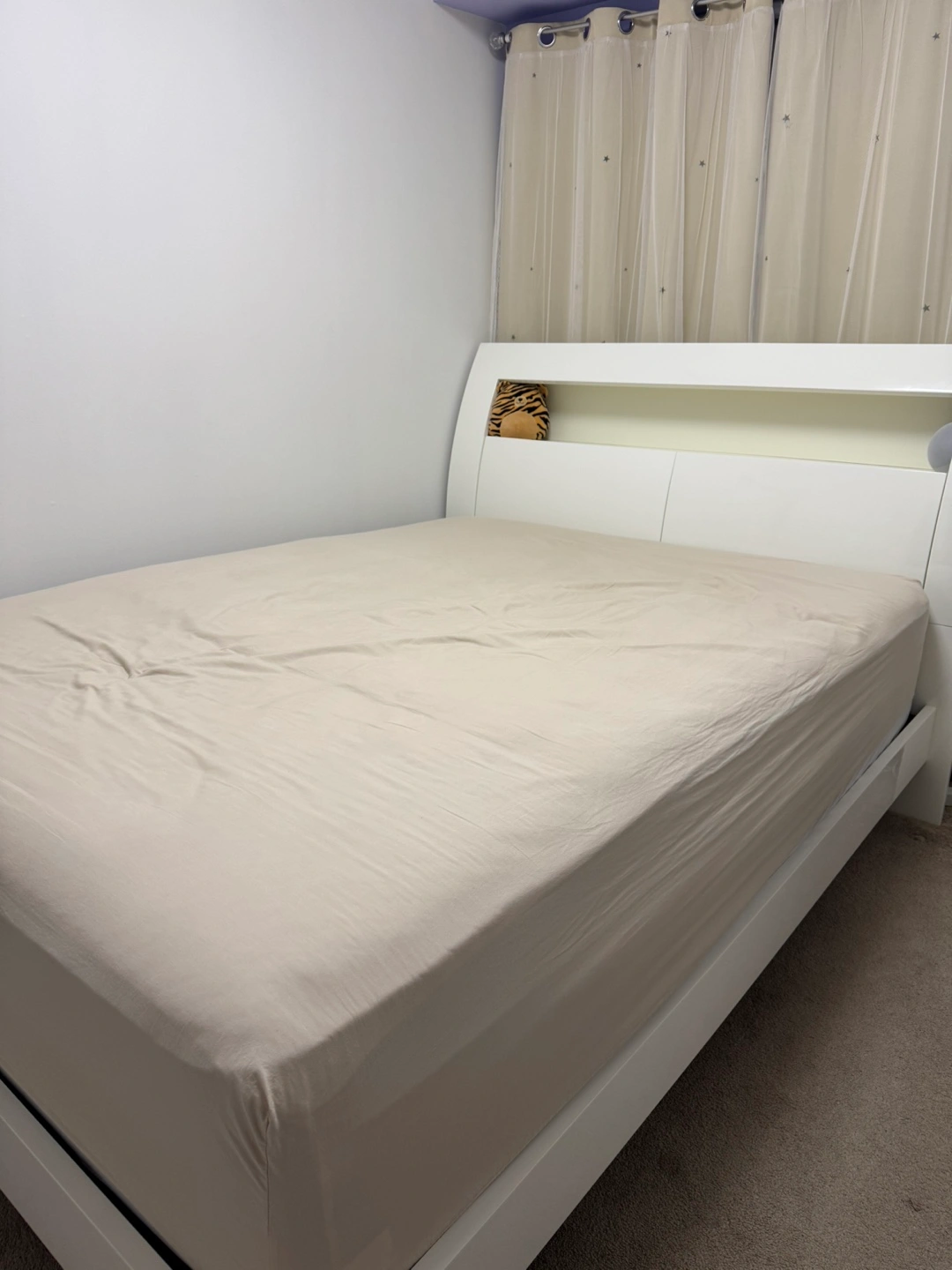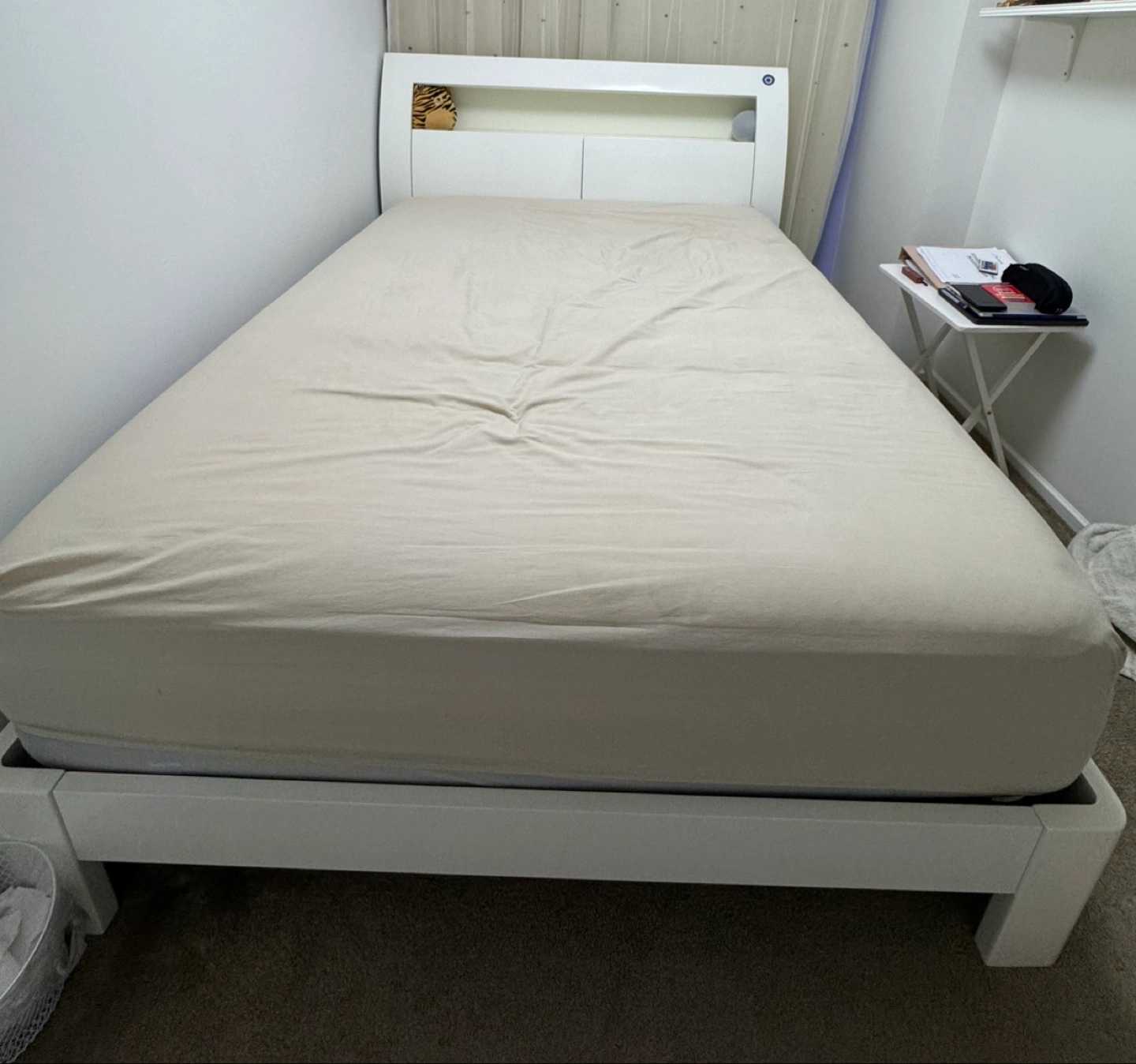 White Double size bed frame. Modern design. Built-in headboard shelves. Sleek and stylish. Excellent condition. Is new from no smoking and very clean