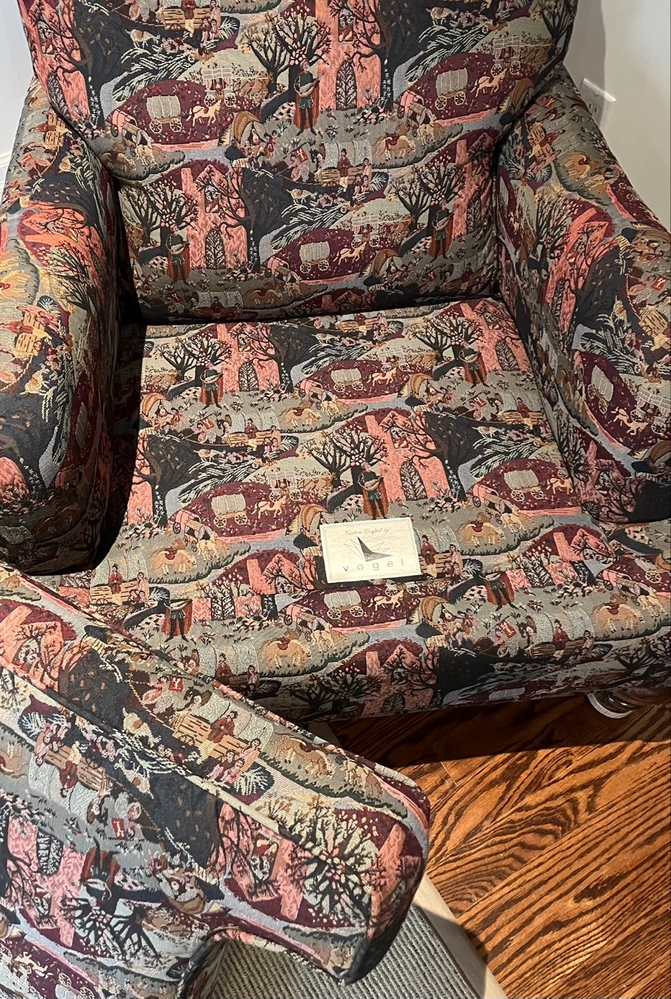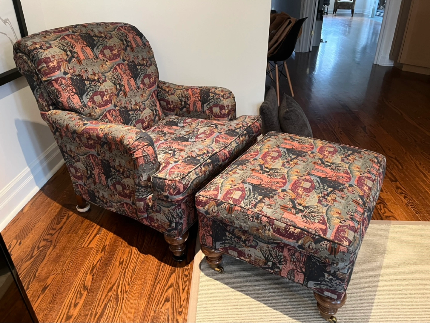 $30!! Comfortable, beautifully crafted armchair and ottoman set. Chair and Ottoman have matching fabric. Dark wood legs.