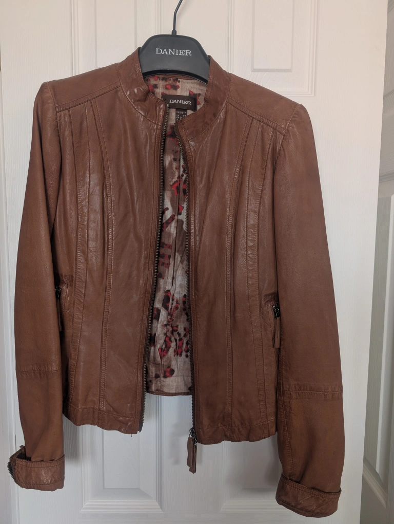Beautiful brown lamb leather jacket. Bomber style jacket. Silky soft to the touch. Pretty inner lining. Rarely worn.