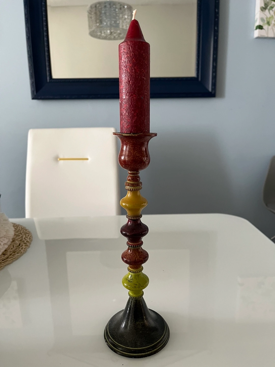 235Tall candlestick holder. Features a dark base and colourful, textured accents. Accommodates a standard taper candle.