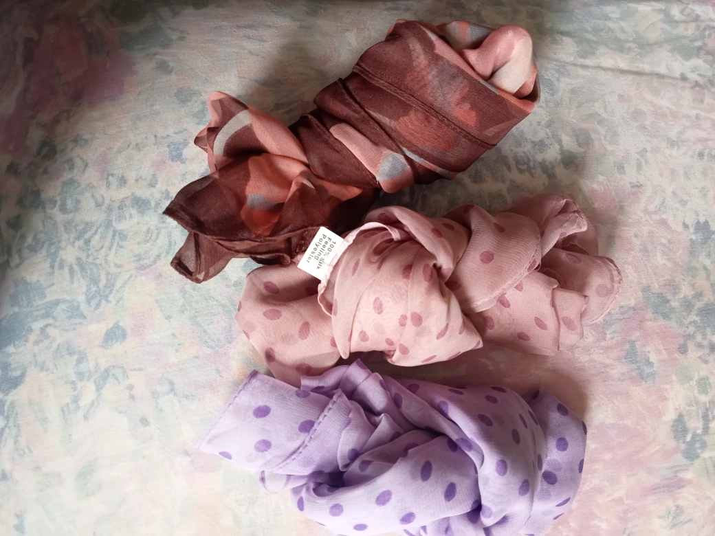 Set of three lightweight Silk Scarves. One features a floral pattern in shades of brown and pink. Two others have polka dots; one pink and one purple. Great for spring and summer.