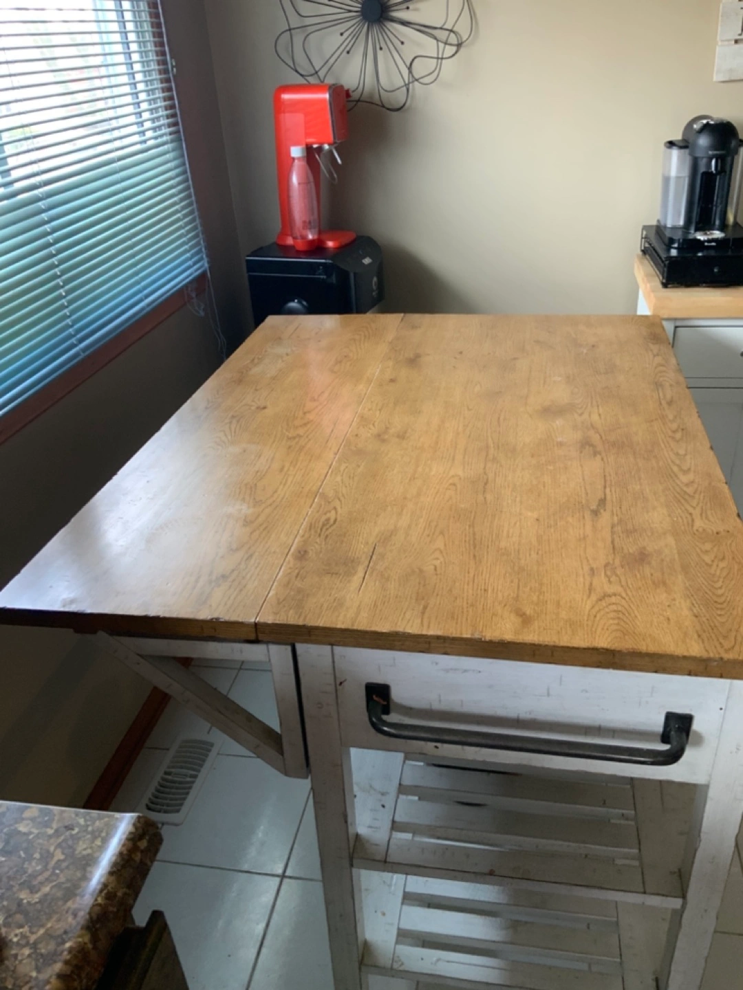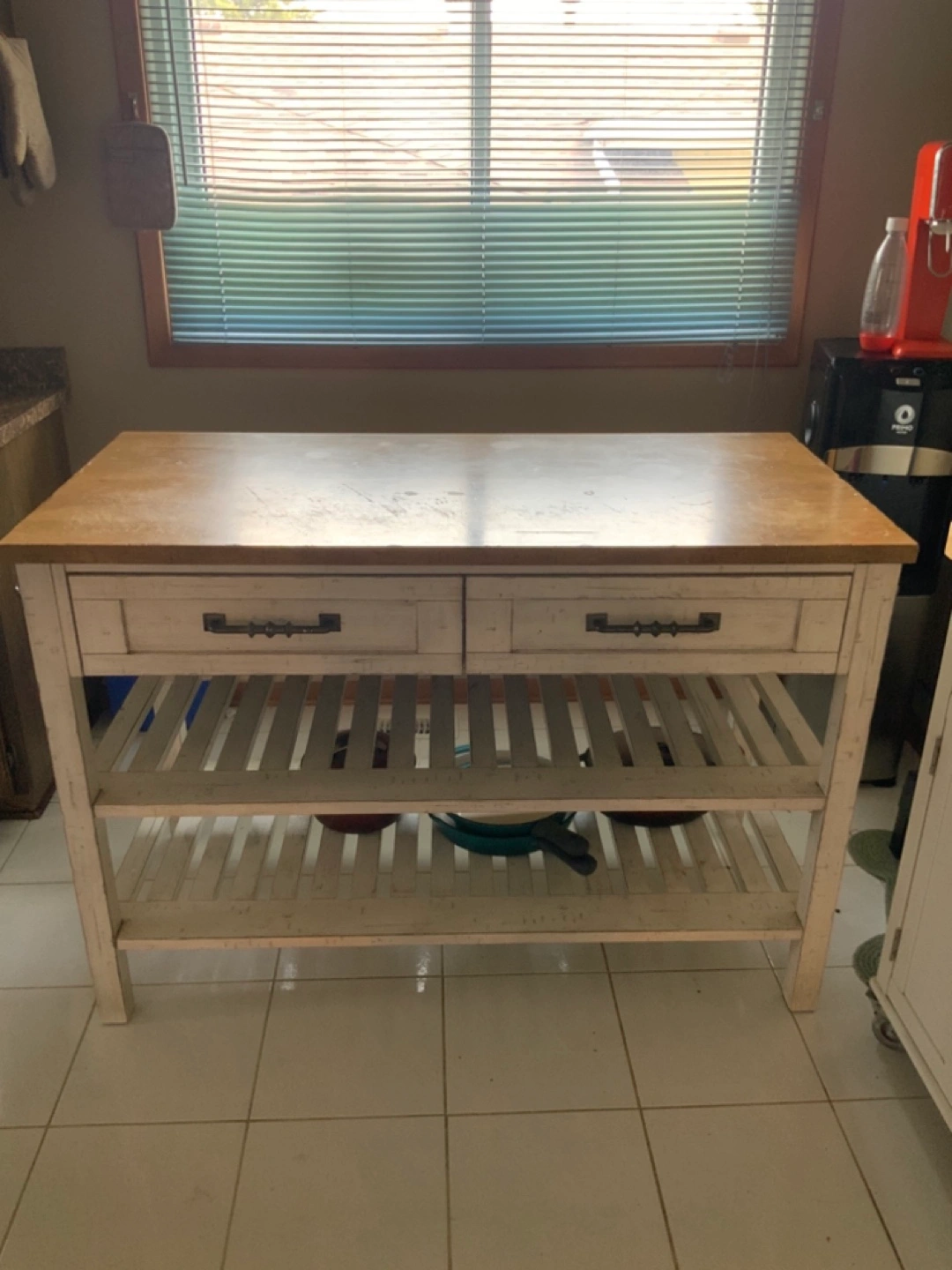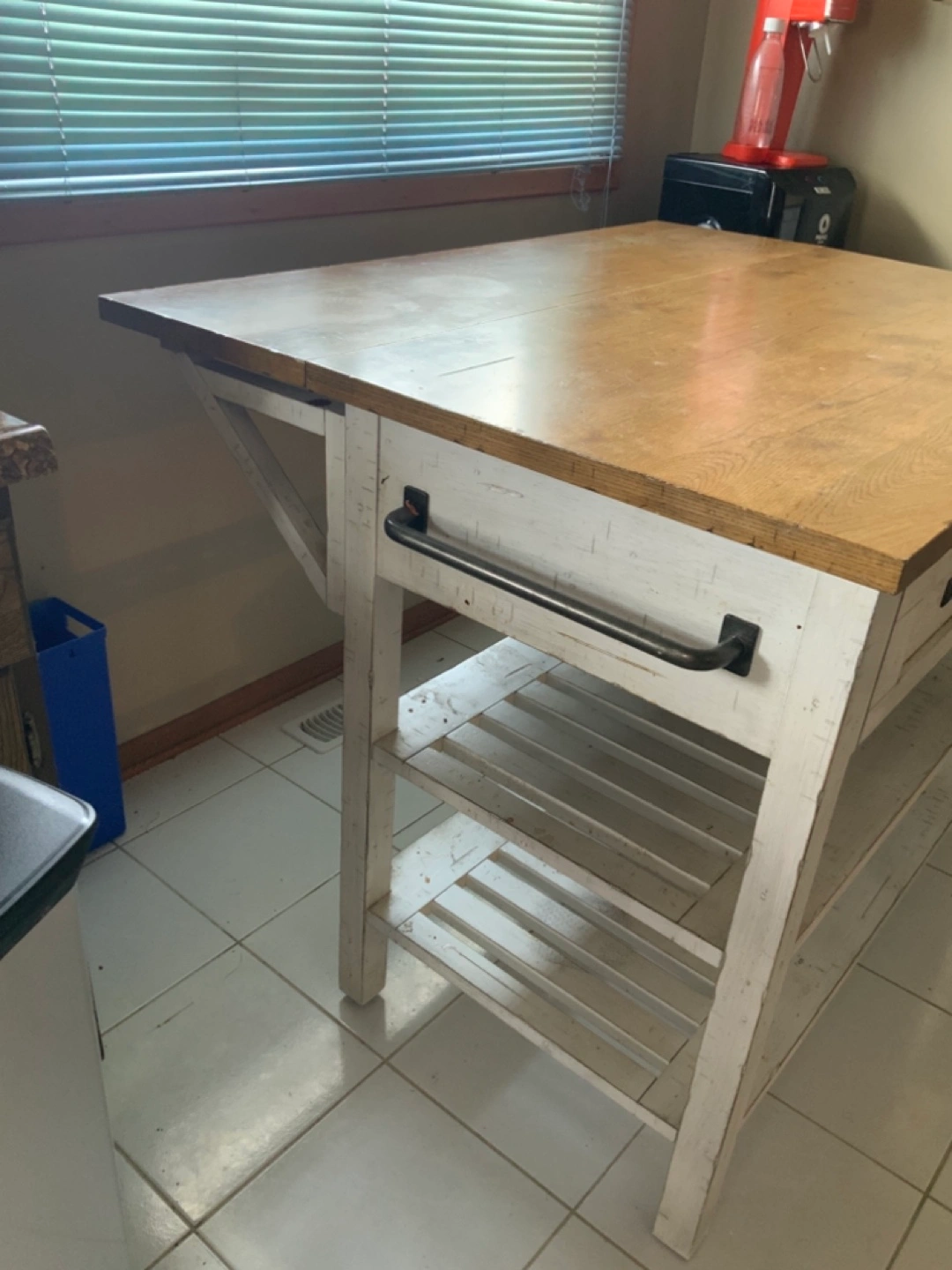 White kitchen island. Two drawers and open shelving. Drop leaf extension. Butcher block countertop.