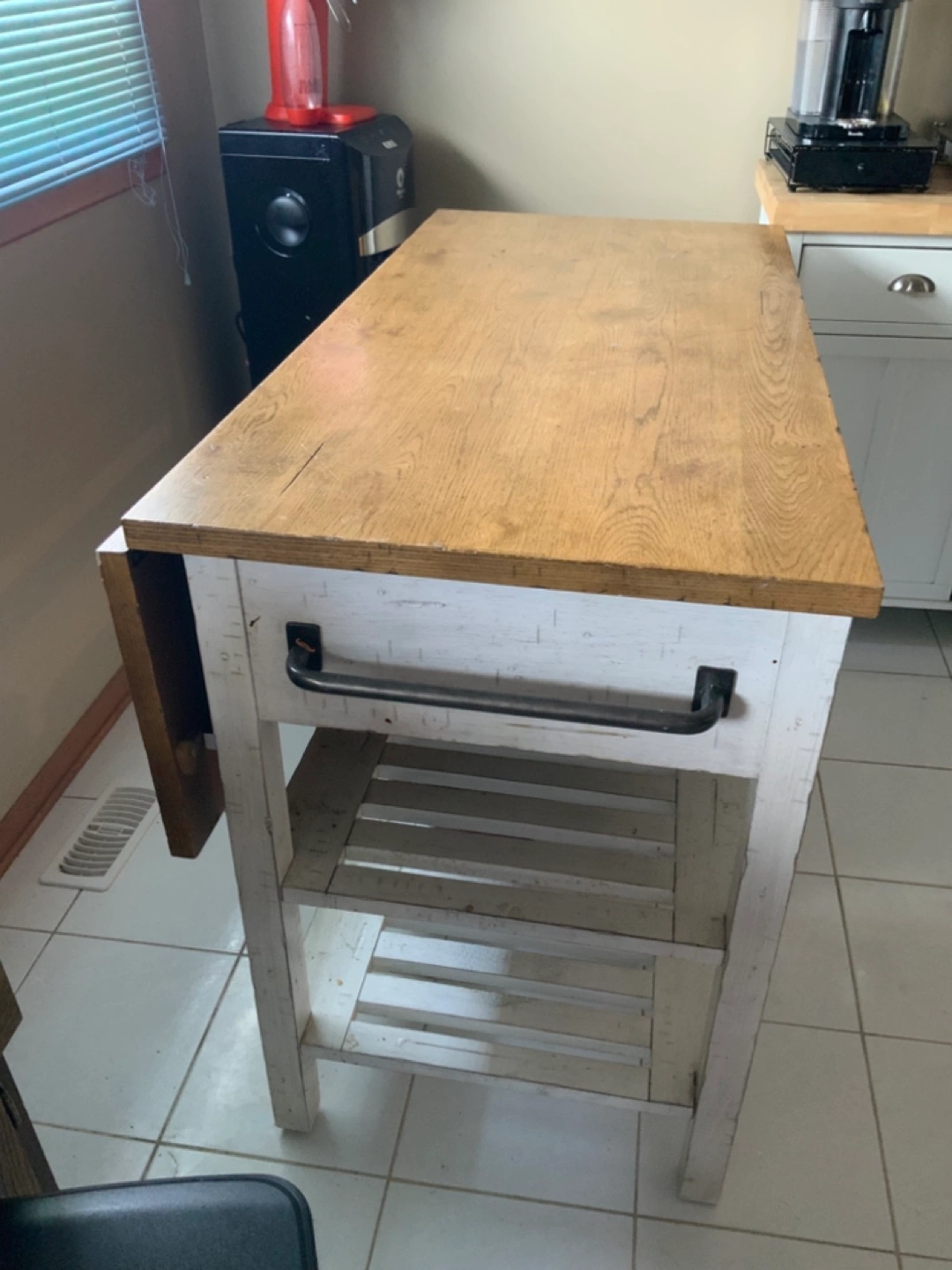 White kitchen island. Two drawers and open shelving. Drop leaf extension. Butcher block countertop.
