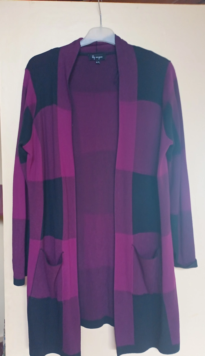 Women's long-sleeved cardigan, purple and black check pattern. Open front, pockets. Size XL, used, like new, $15, pick up only, please see my other listings.