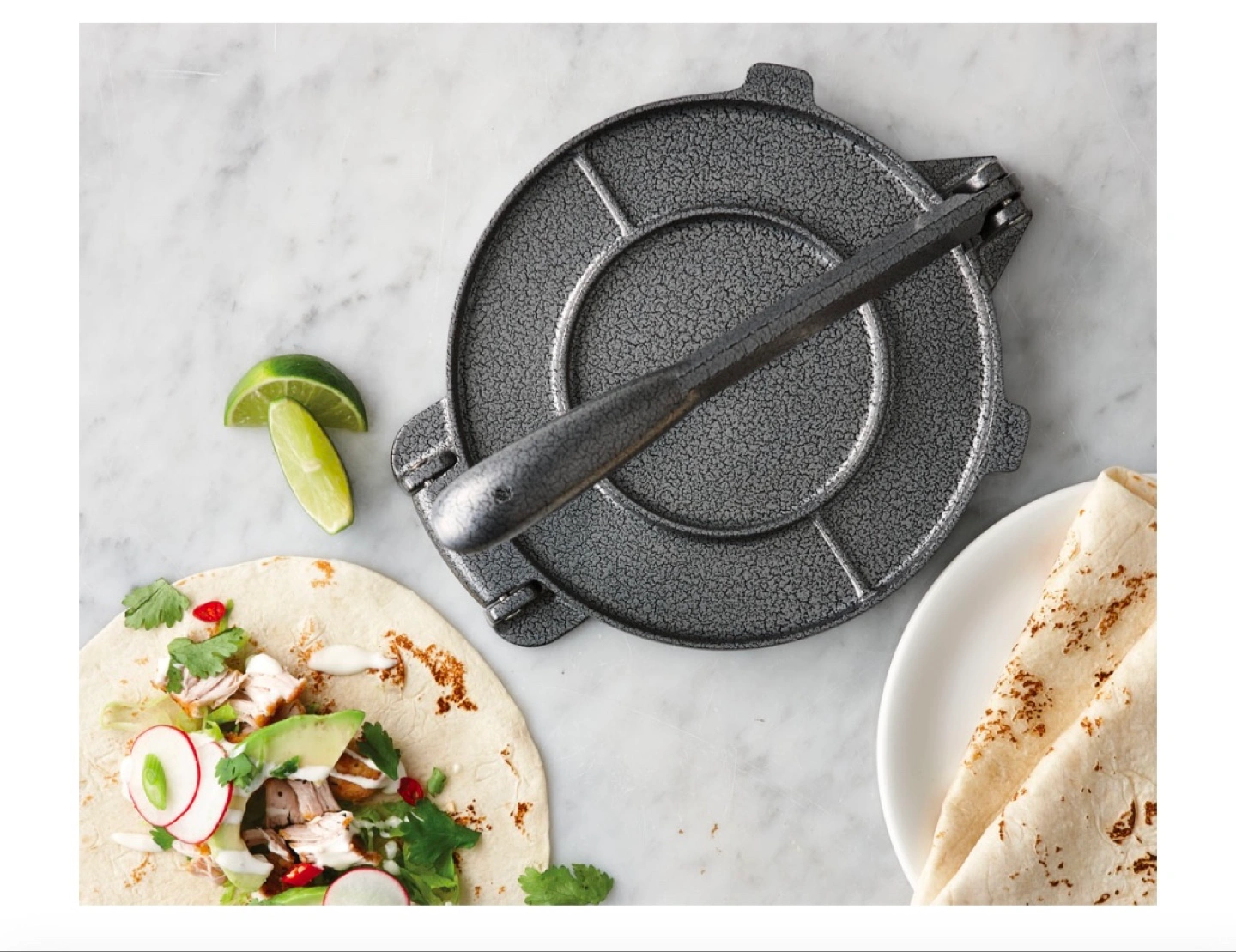 Durable cast iron construction. Makes perfect tortillas every time. Easy to use and clean. Great for making tacos and other Mexican dishes.
