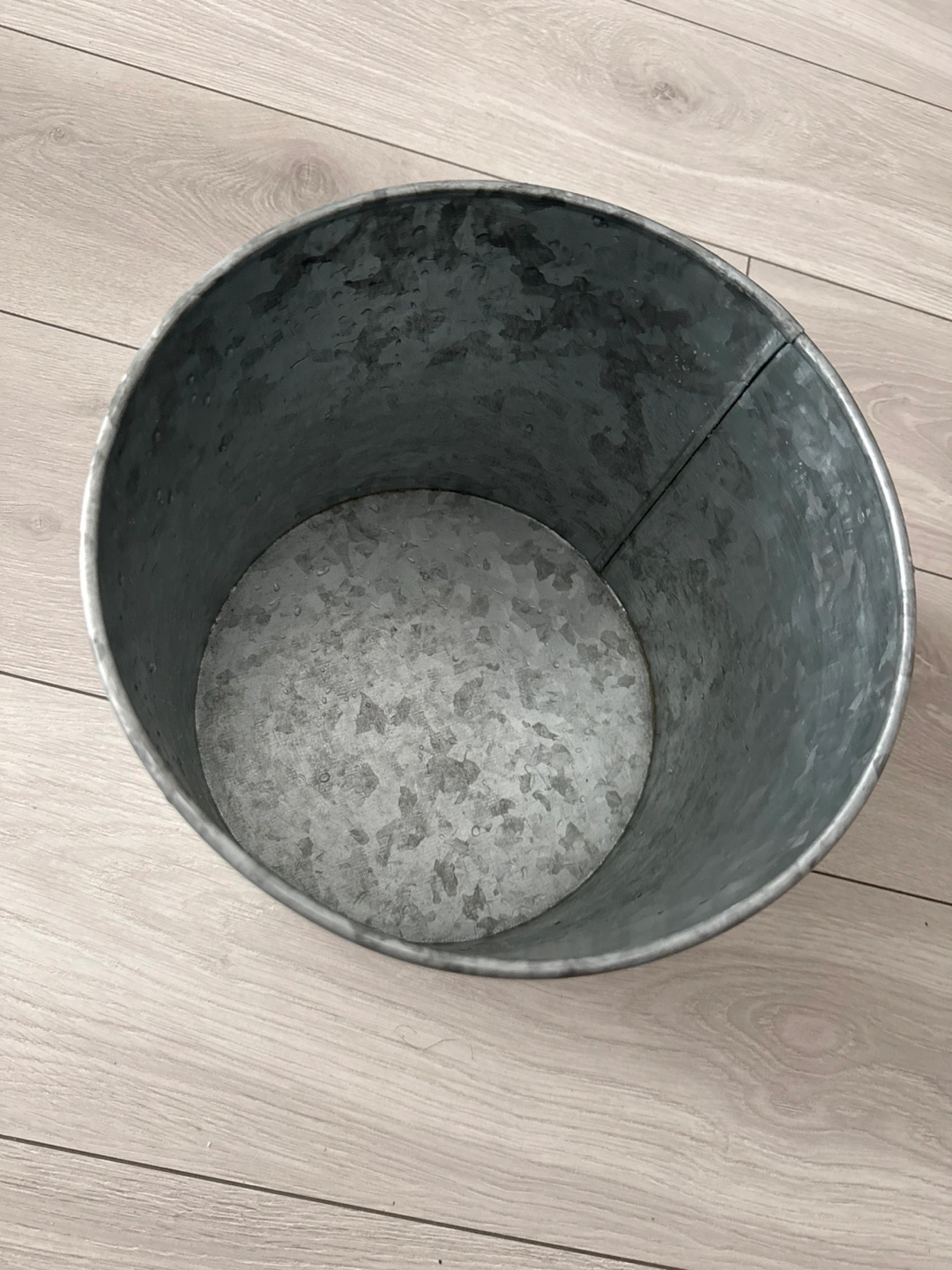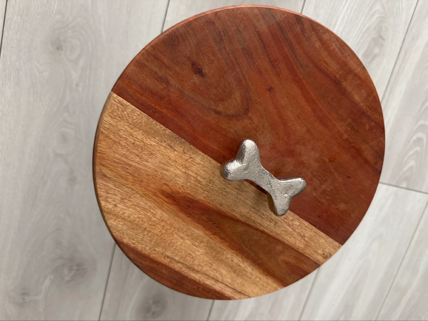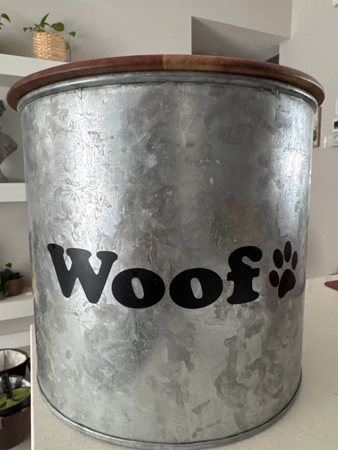 Adorable dog food container. Features a galvanized metal body, wooden lid with bone-shaped handle, and a cute "Woof" decal. Perfect for storing pet food.
