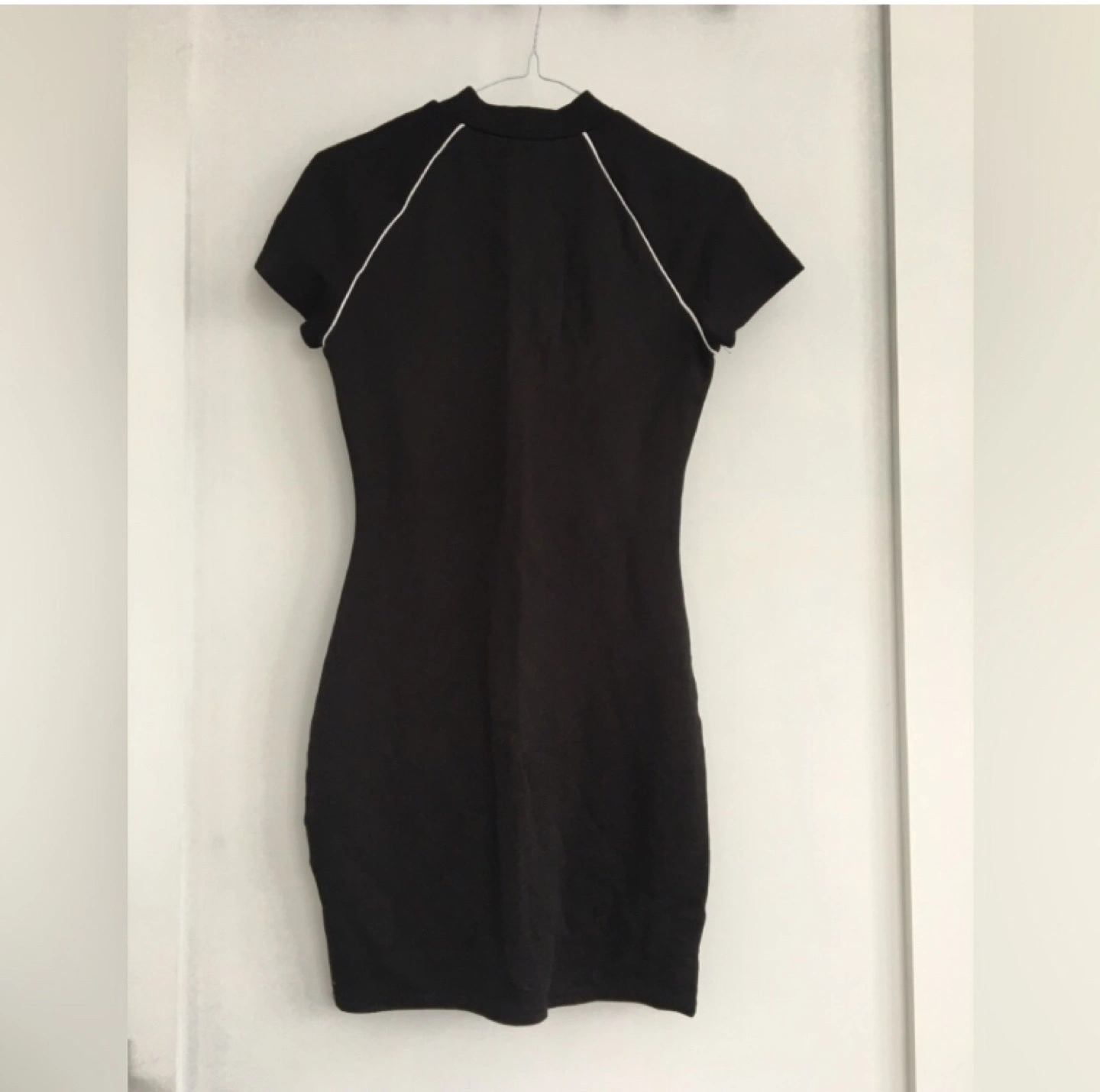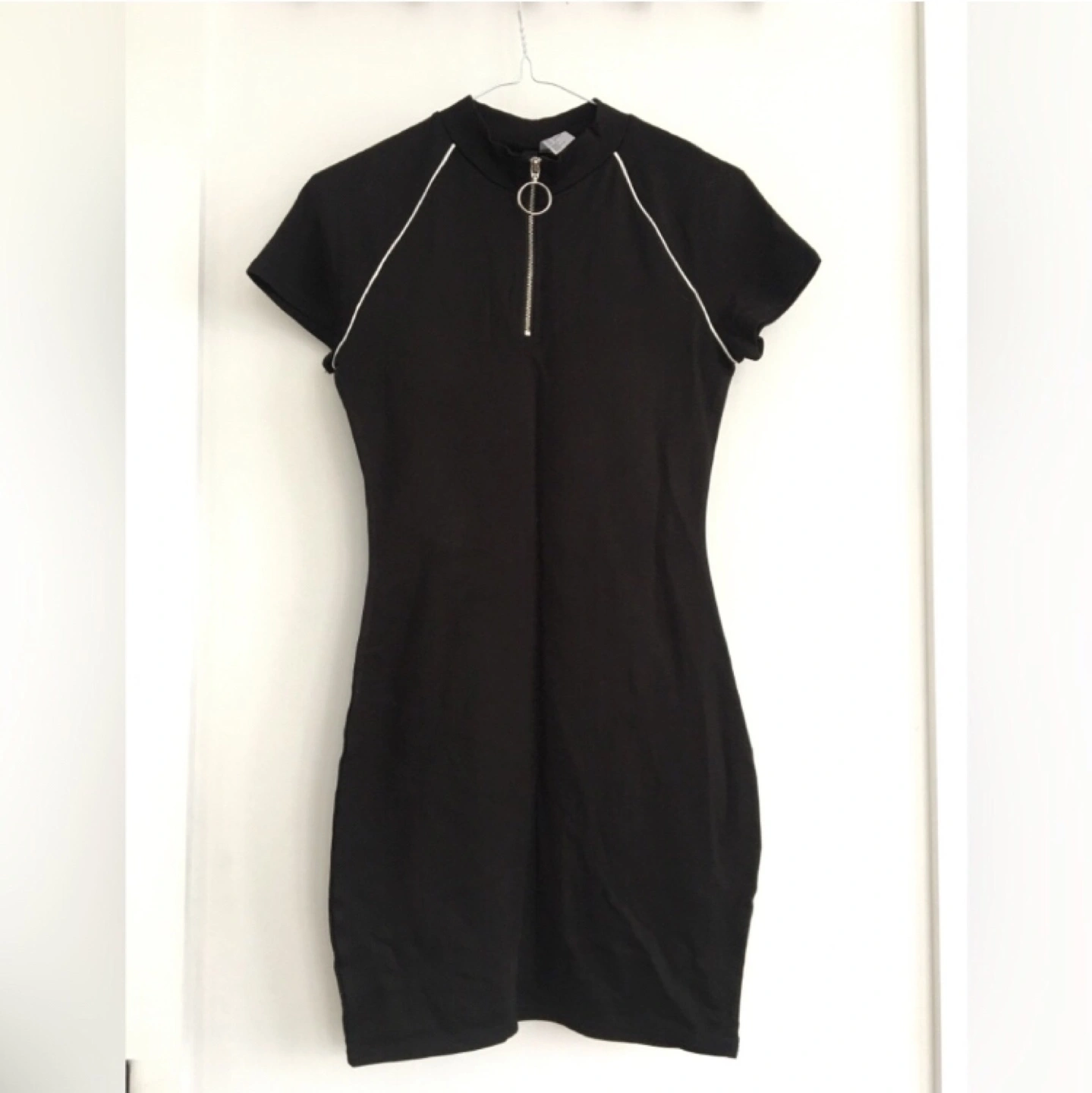 118Black mini dress. Size 4. Short sleeves. Mock neck. Zip detail. White piping detail.