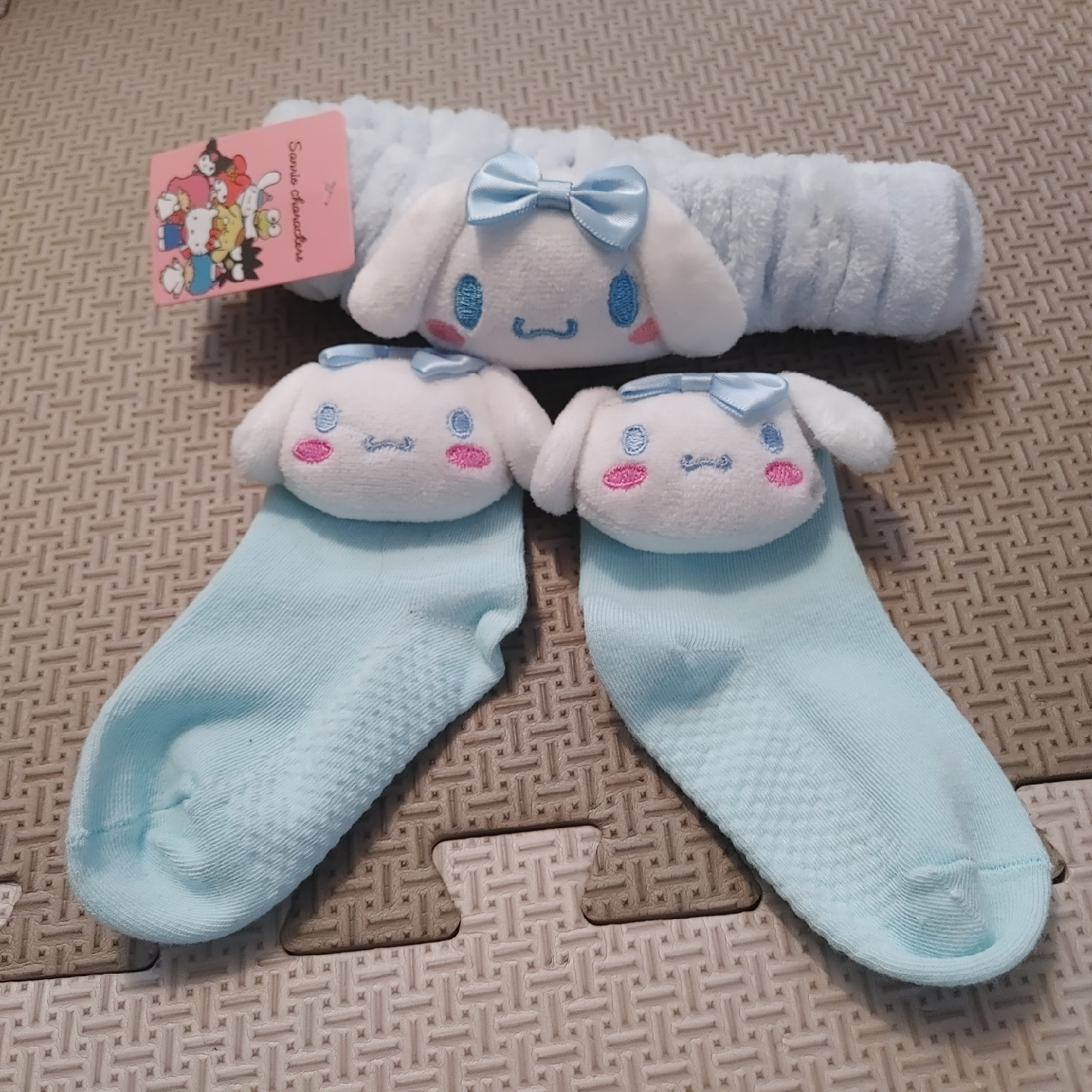 Super cute Cinnamoroll set! Includes a pair of socks and a matching headband, both in a soft, light blue colour. Perfect for any Sanrio fan!