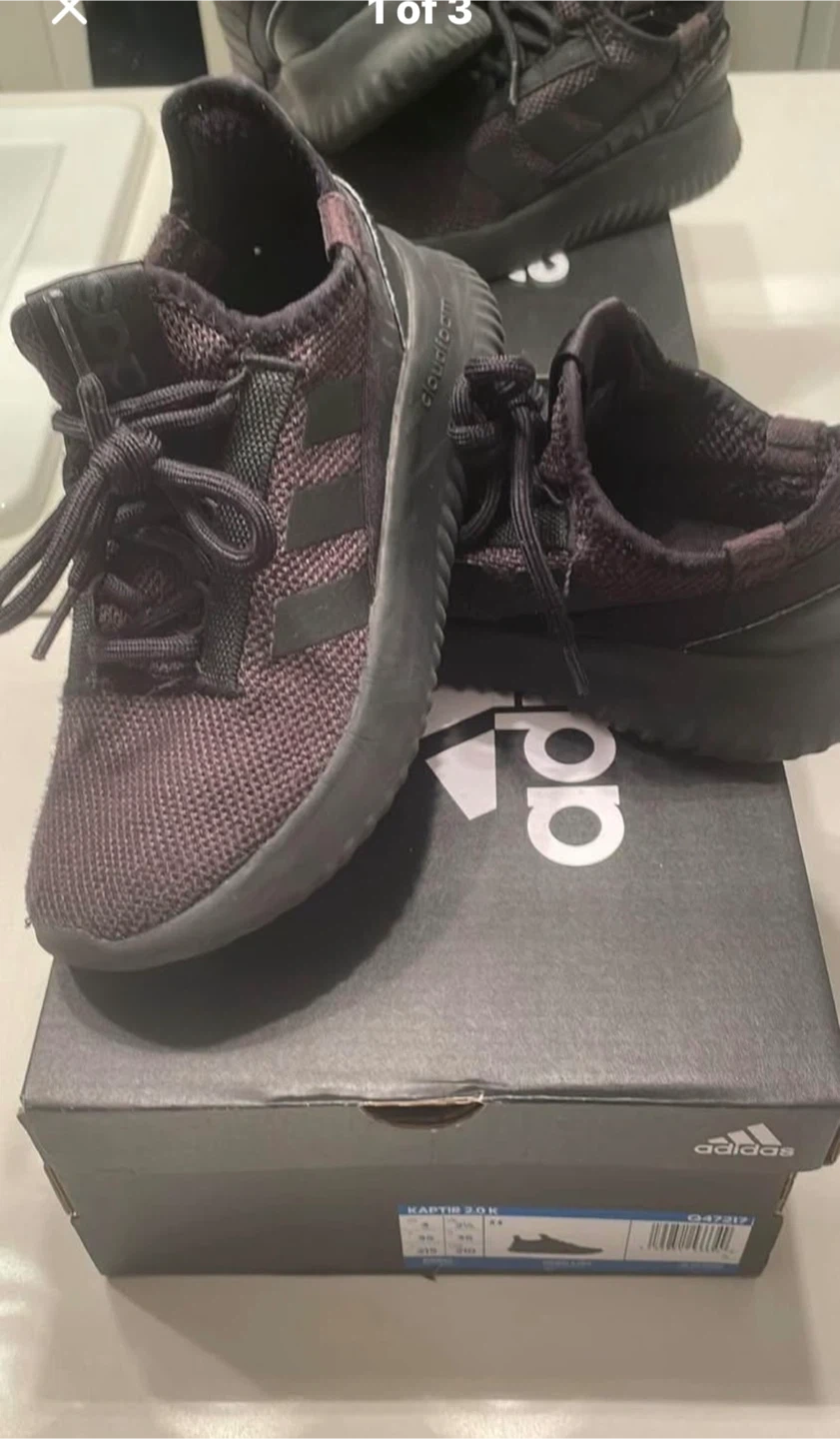 Adidas Kaptir 2.0K running shoes in black. These shoes are size 3Y. They're designed with a knit upper for breathability and a cushioned sole. Perfect for everyday wear or light athletic activities for kids.