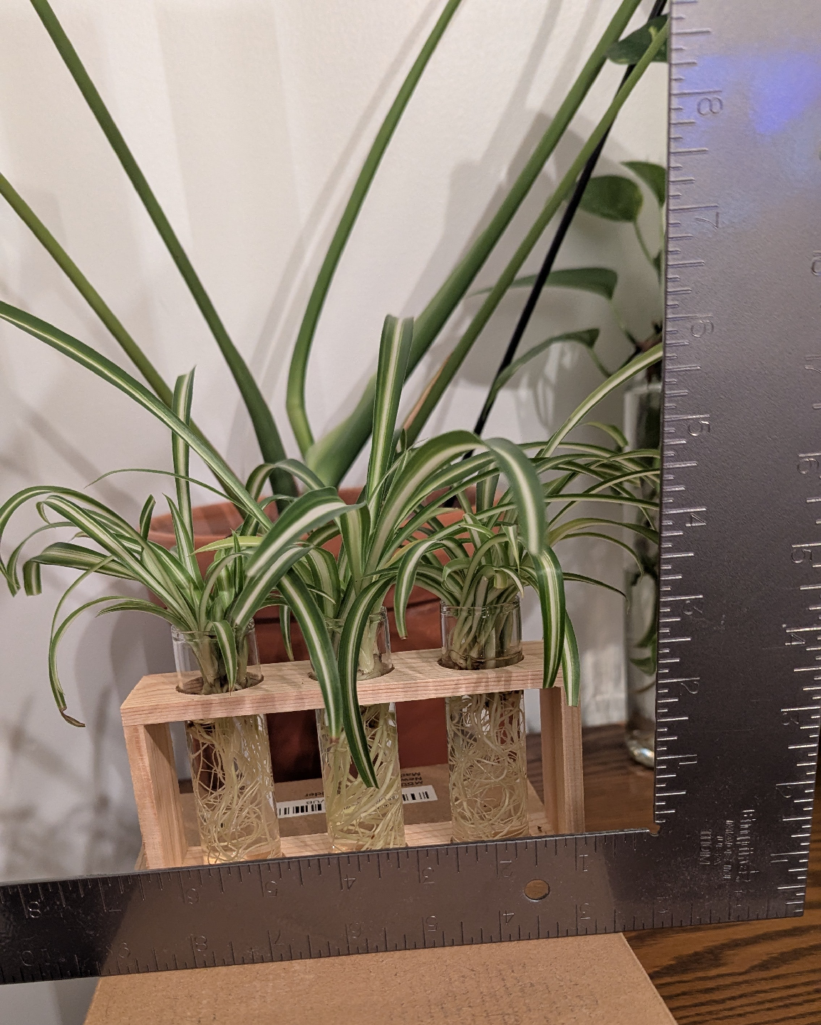 A wooden propagation station. Holds three glass test tubes. Plants in the tubes, showing developed roots. Perfect for a peaceful and relaxing space.
