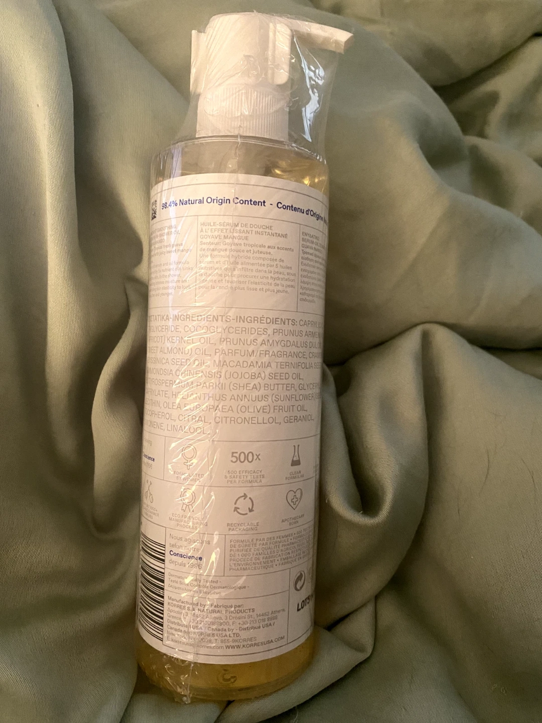 This is a new, sealed KORRES Instant Smoothing Serum-In-Shower Oil in Guava/Mango scent. It's an 8.45 oz bottle, perfect for daily use. It's formulated as an oil with ingredients like Shea Butter and Jojoba Seed Oil, suitable for all skin types and the full body. It's also animal cruelty-free. Feel free to message if you have any questions!