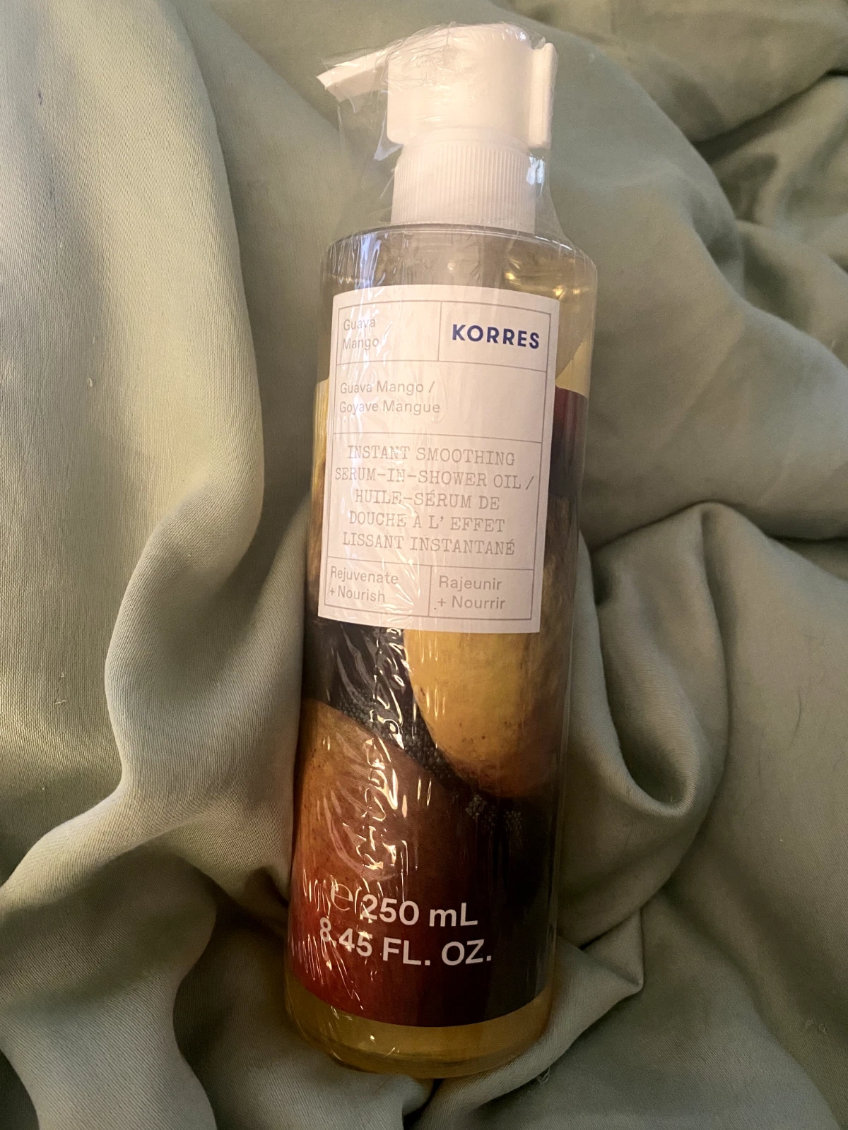 This is a new, sealed KORRES Instant Smoothing Serum-In-Shower Oil in Guava/Mango scent. It's an 8.45 oz bottle, perfect for daily use. It's formulated as an oil with ingredients like Shea Butter and Jojoba Seed Oil, suitable for all skin types and the full body. It's also animal cruelty-free. Feel free to message if you have any questions!