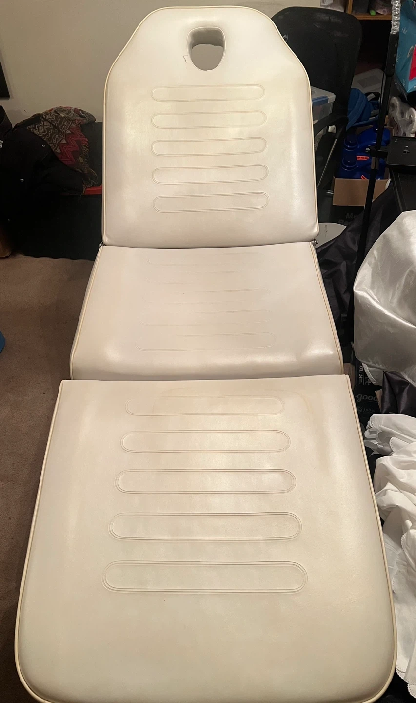 It’s used but in good condition, a bit of discolouration but the cushion is still great, sturdy. Sold as is, does not have headpiece ot arm rests!