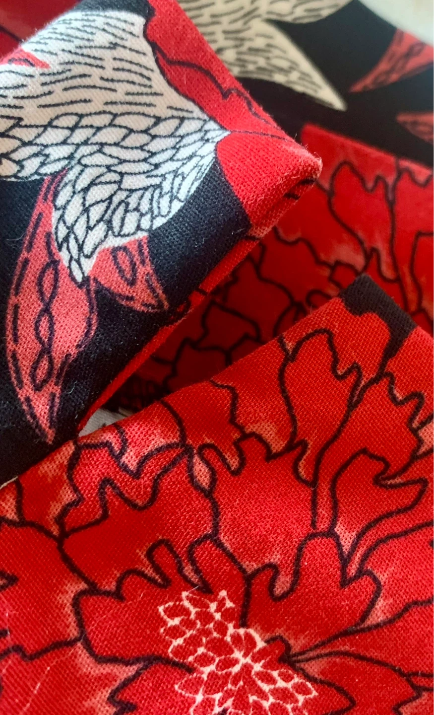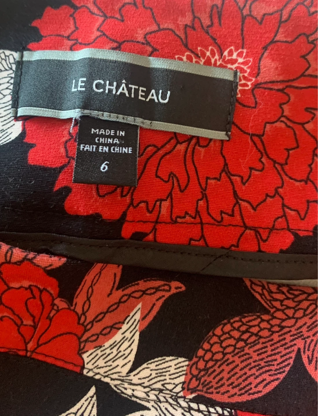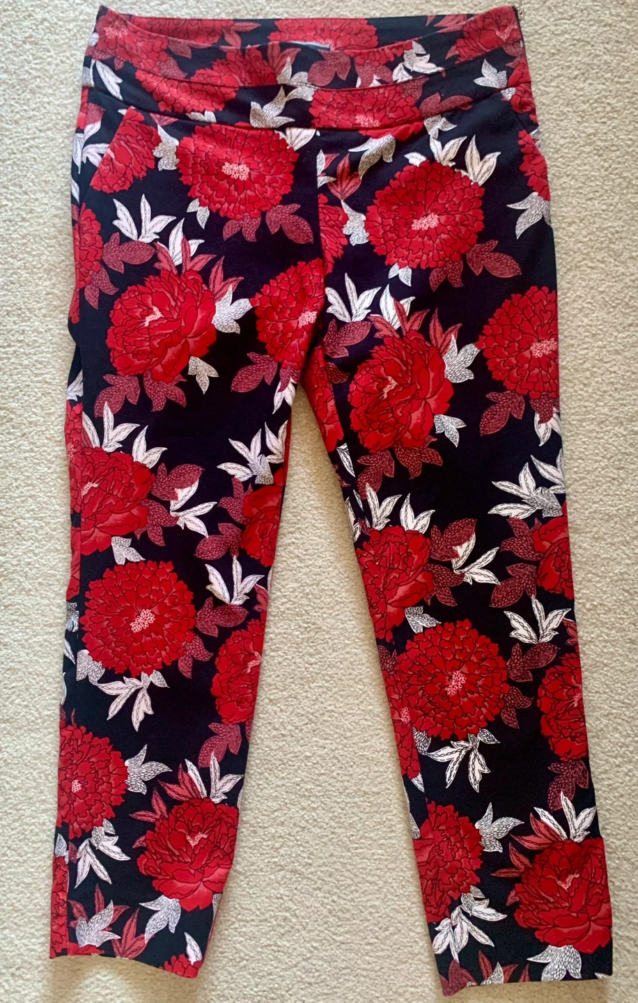 These LE CHÂTEAU pants feature a bold red and white floral print on a black background. Side zipper closure and a size 6 tag. They're a stylish addition to any wardrobe! 25” inseam; I wore as just above ankle pants.