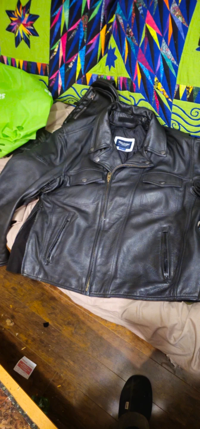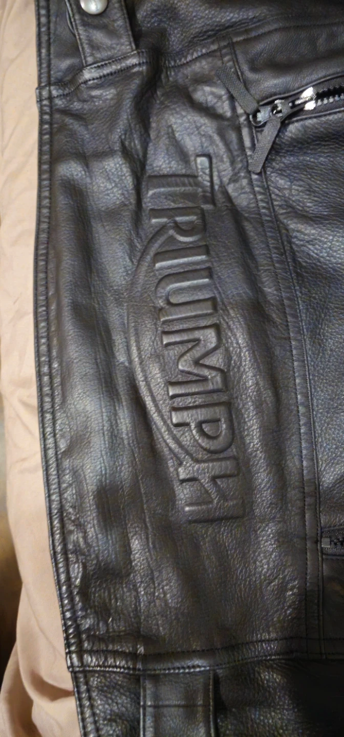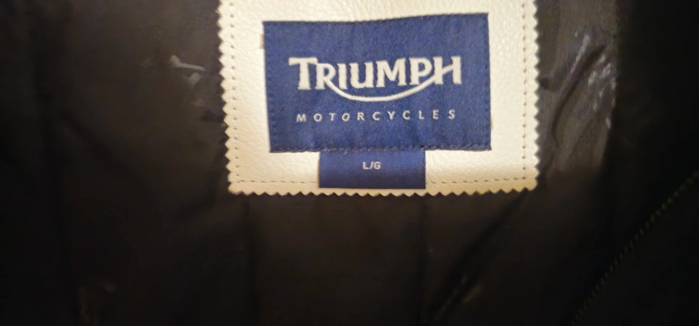 This is a Triumph Motorcycles leather jacket for men. It's a size L/G. Features include a durable leather exterior and a comfortable inner lining.
