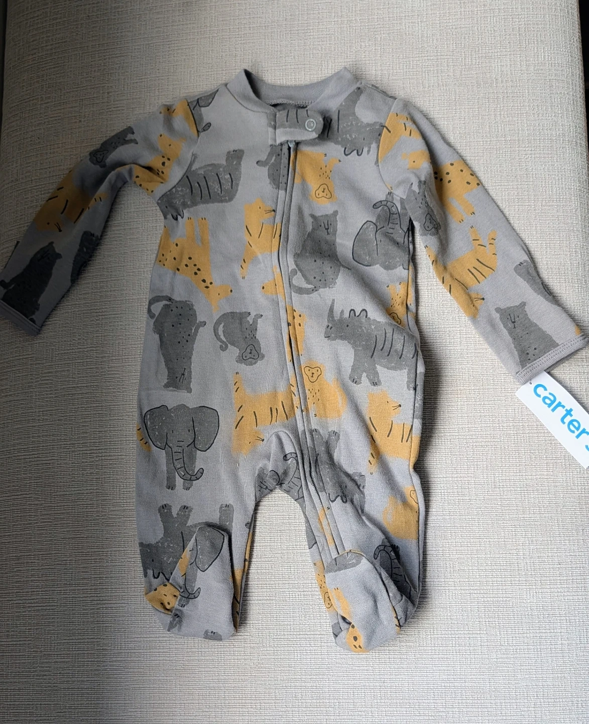 Carter's baby sleepsuit in a 3-month size with a cute animal print. It features a 2-way zipper for easy changes. Made from soft fabric for comfy wear. Perfect for everyday use or bedtime!