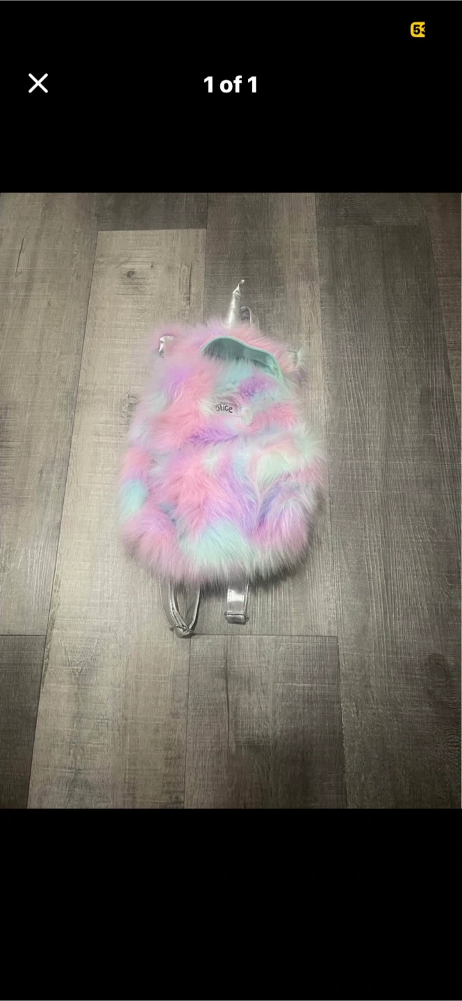 Justice brand unicorn backpack with a fuzzy pastel tie-dye design. Features silver straps and a metallic horn. Perfect for kids who love unicorns!