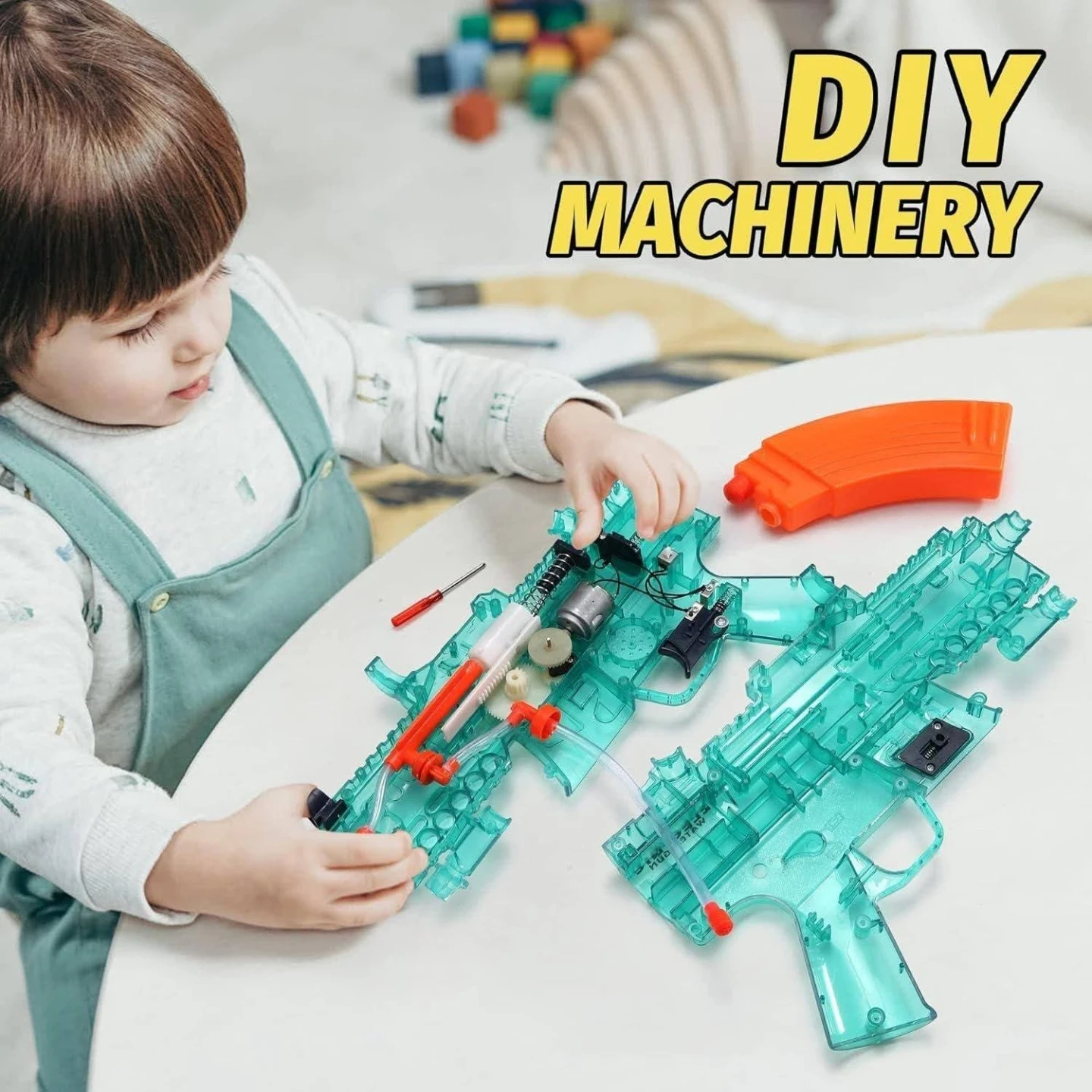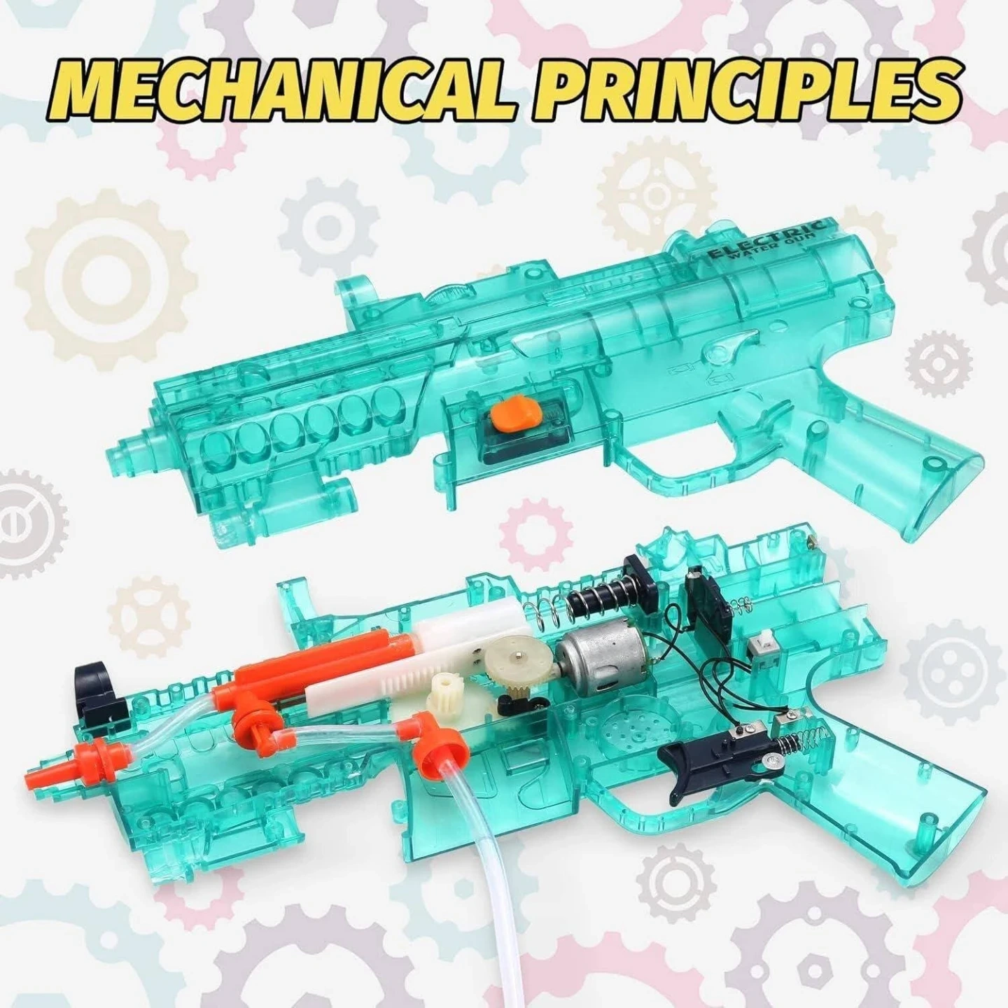 This electric water gun shoots up to 32 feet. It's a DIY machinery kit that demonstrates mechanical principles. Requires 4x AA batteries, not included.
