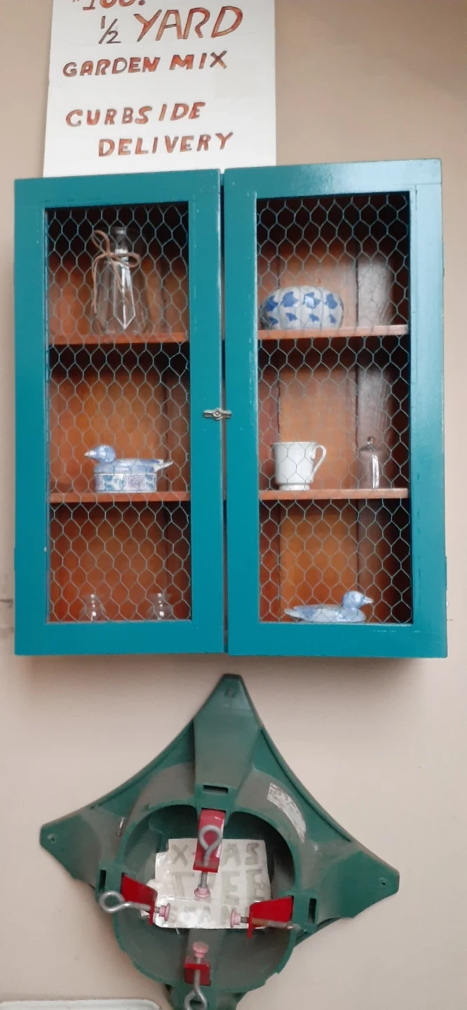 Teal Chicken Wire Cabinet with Glassware and Decor