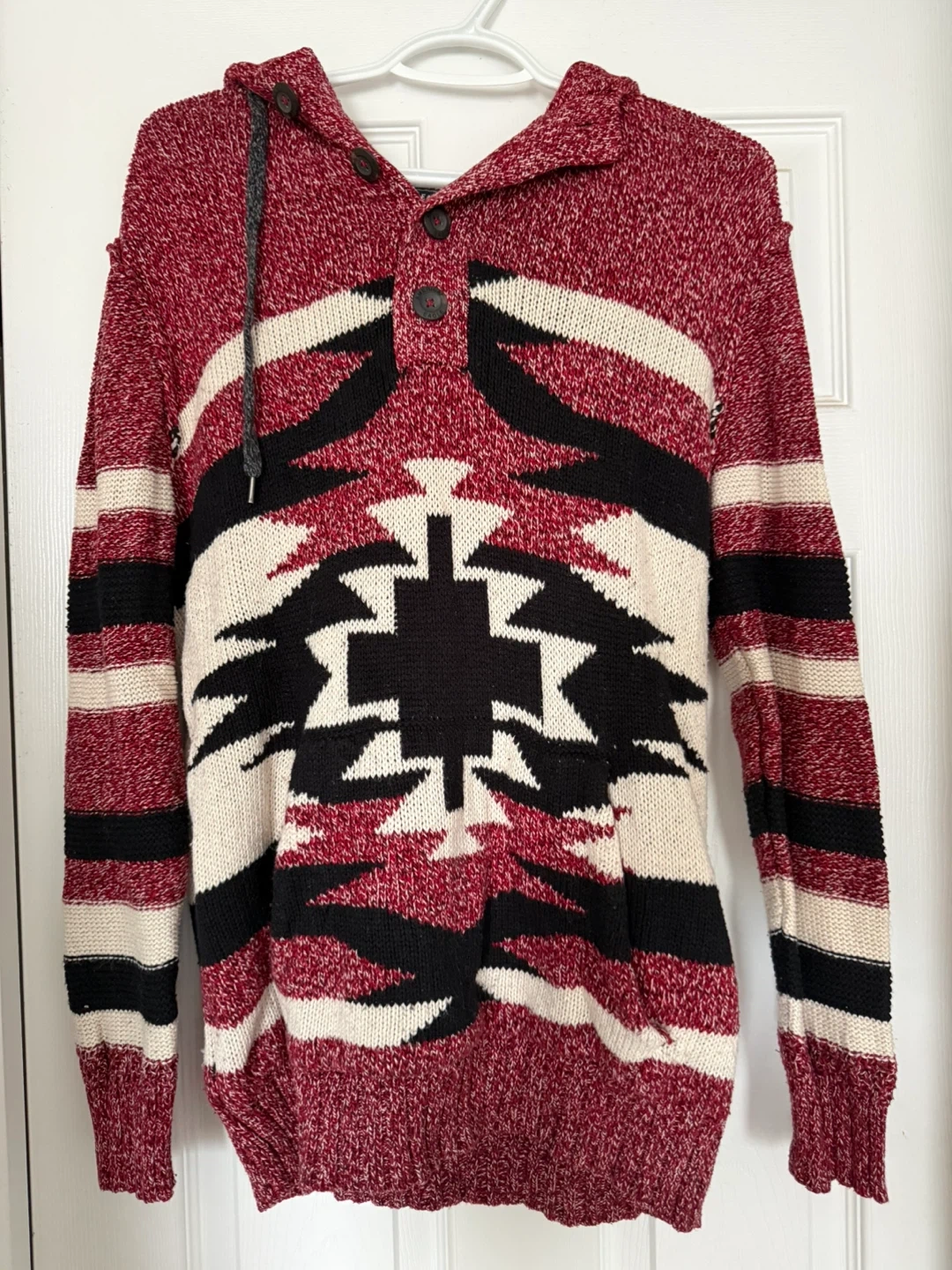 Cozy American Eagle hooded henley sweater featuring a bold Aztec-inspired print. It's made from a soft knit material, perfect for cooler weather. The front has a button-up placket and a front pouch pocket. This sweater is a great layering piece for casual wear.