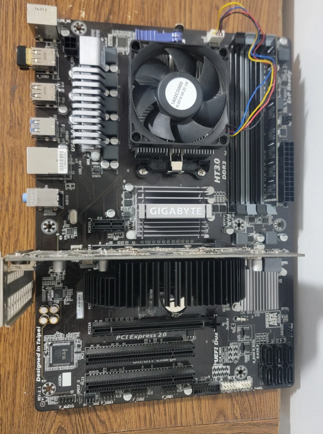 Gigabyte GA-970A-DS3P motherboard with AMD FX-6300 cpu, 8gb 1333 ram and rx 460 4gb gpu. Includes io shield and motherboard screws.