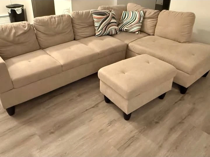 Selling a comfy beige sectional sofa, perfect for a living room or family space! It comes with an ottoman to put your feet up after a long day. The couch is in great condition and ready for a new home!