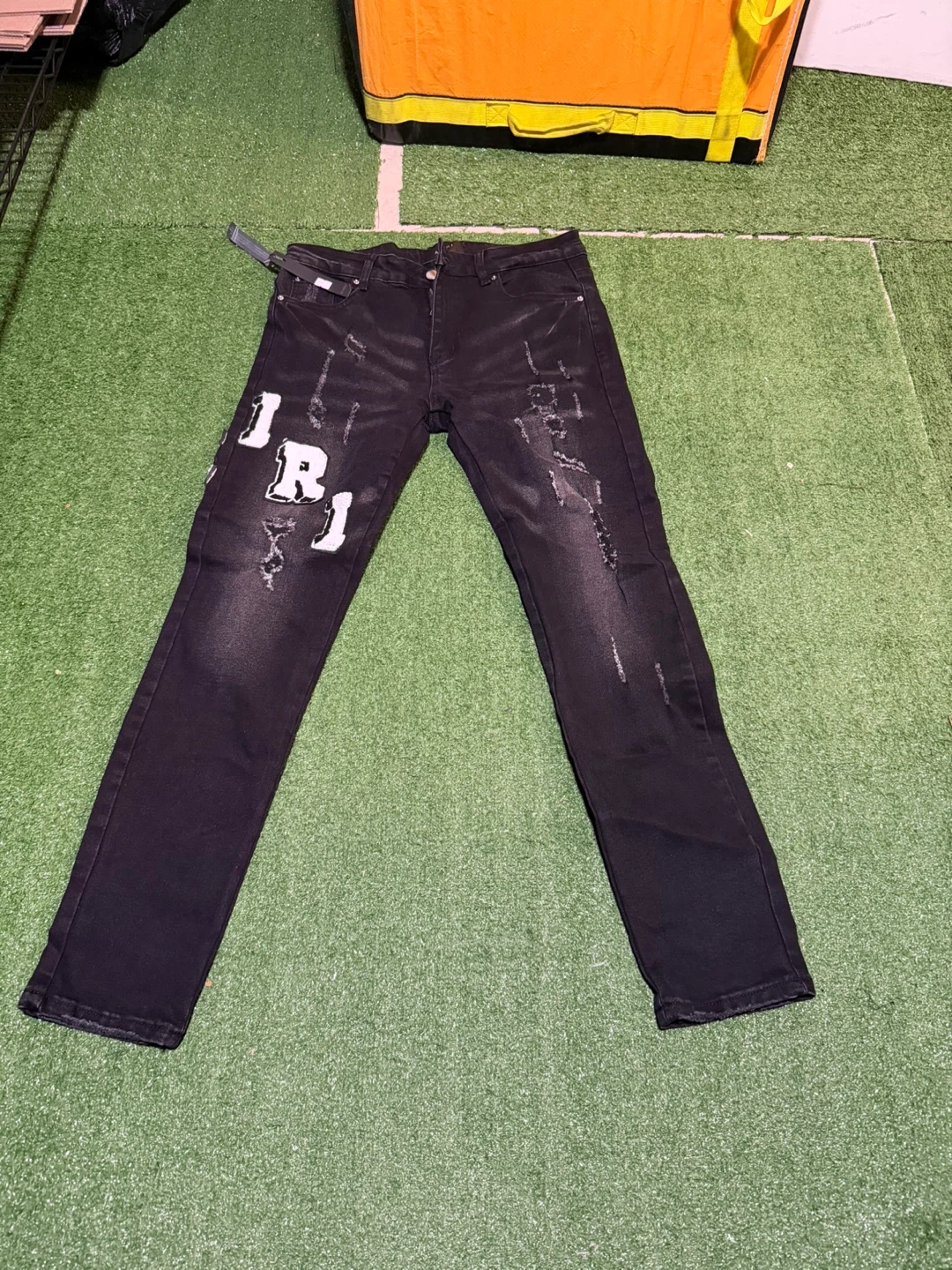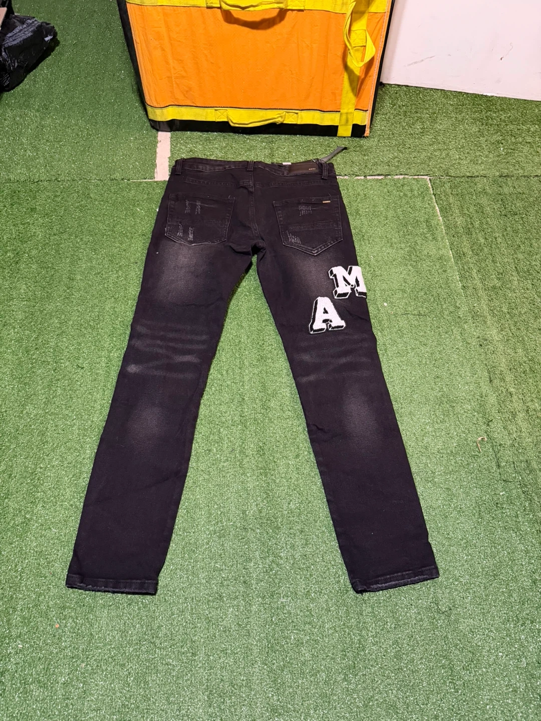 These black distressed denim jeans feature bold "M A" appliqués on the right leg and "I R 1" on the left. It's a straight-leg fit with a button and zip closure. Cotton blend material.