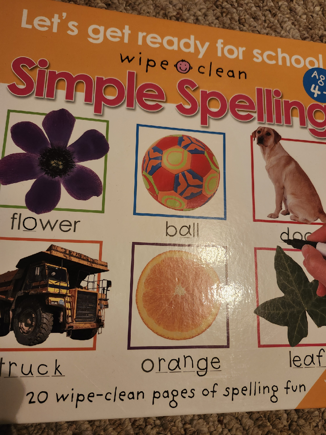Get your little one ready for school with this Simple Spelling wipe-clean workbook! It's designed for ages 4+ and features 20 wipe-clean pages of spelling fun. Perfect for learning first letters and last sounds!
